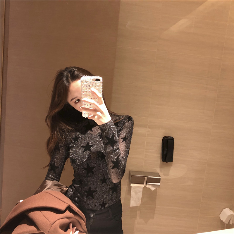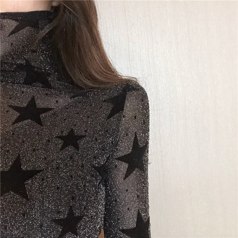 2018秋裝新款韓版時尚上衣復古chic性感打底衫高領星星打底T恤女