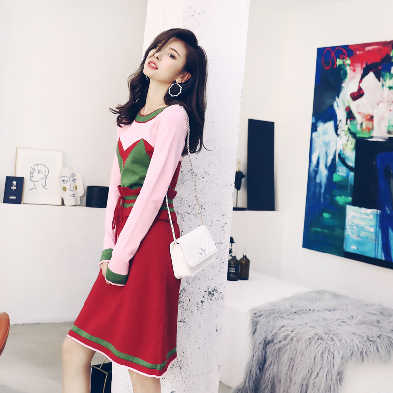 2018秋冬新款圓領時尚毛衣女針織衫拼色套頭修身韓版連衣裙中裙