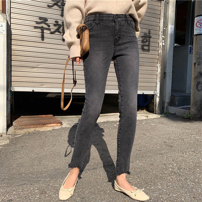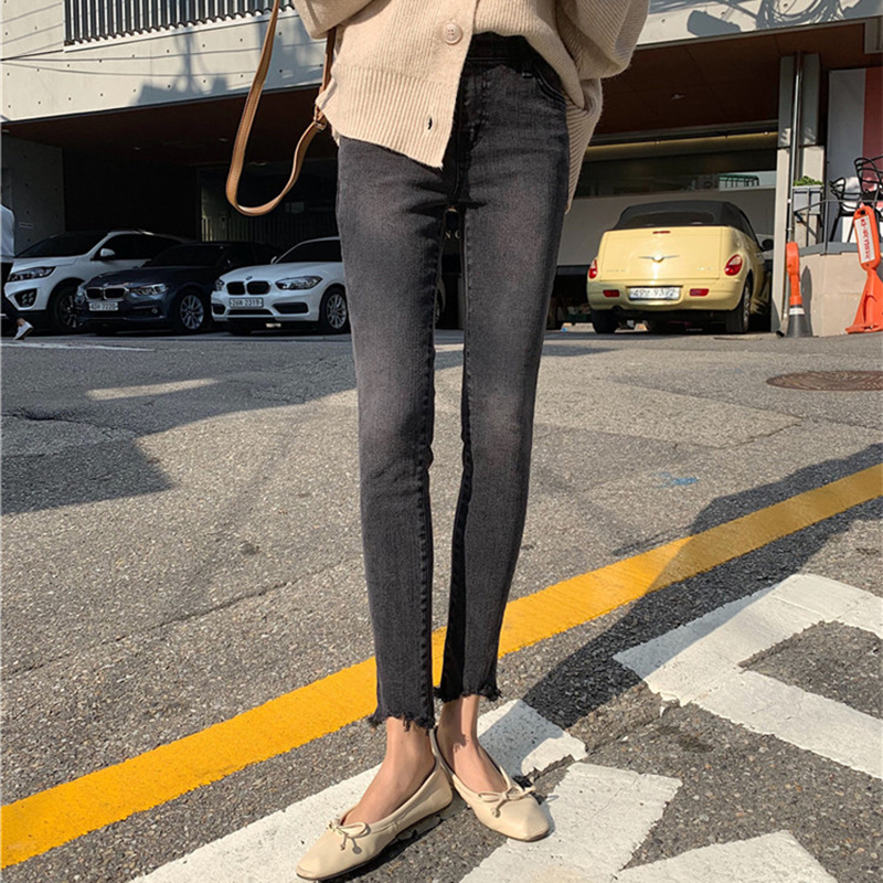 / 高腰顯瘦加絨緊身牛仔褲女秋冬裝新款不規則毛邊休閑鉛筆九分褲子