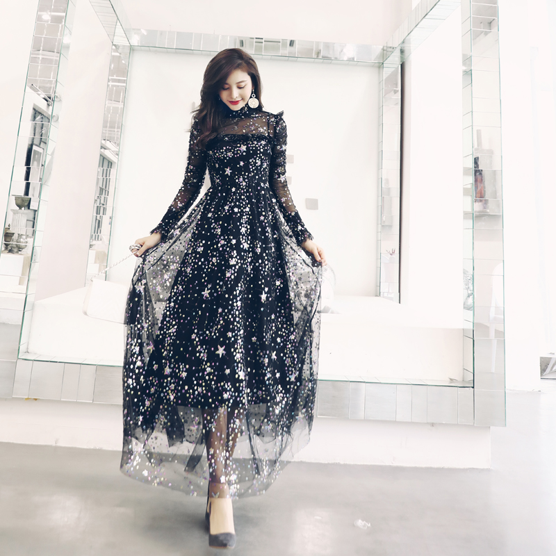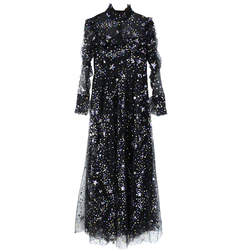 / 甜美公主風2018秋季新款長袖半高領高腰鏤空釘珠荷葉邊連衣裙潮