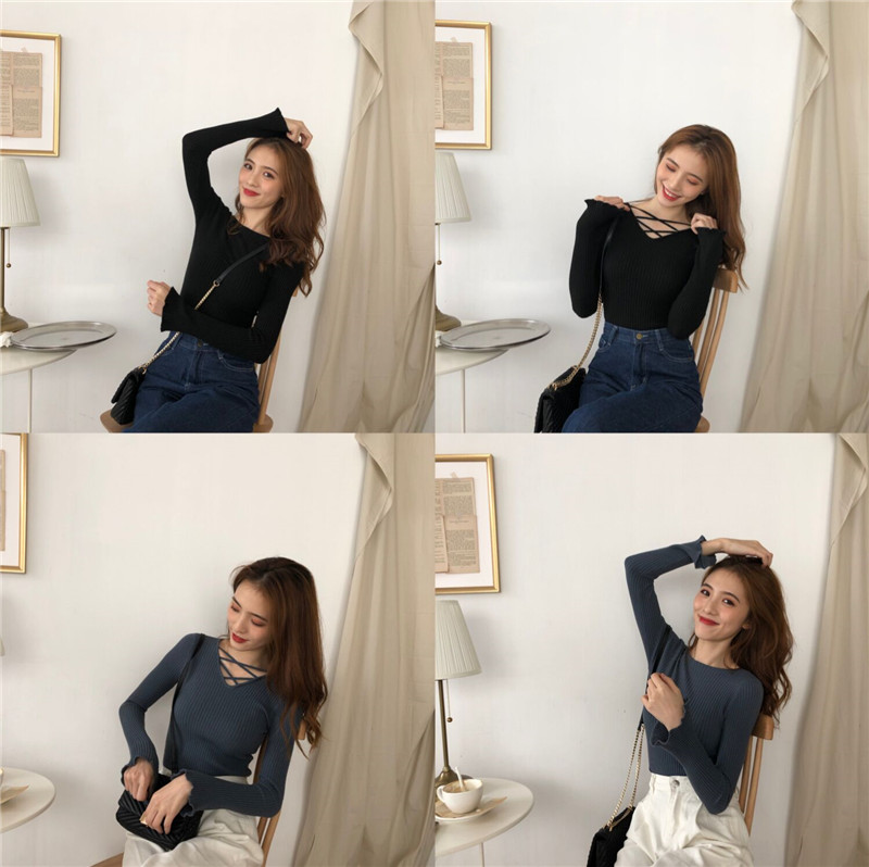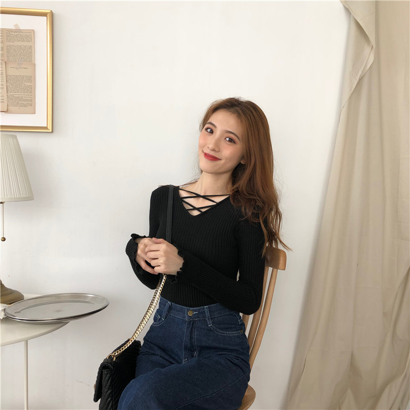 / 復古百搭前后兩穿毛衣女秋冬2018新款交叉V領顯瘦性感打底針織衫