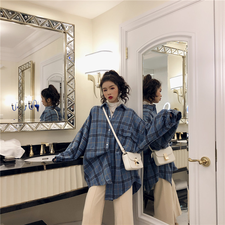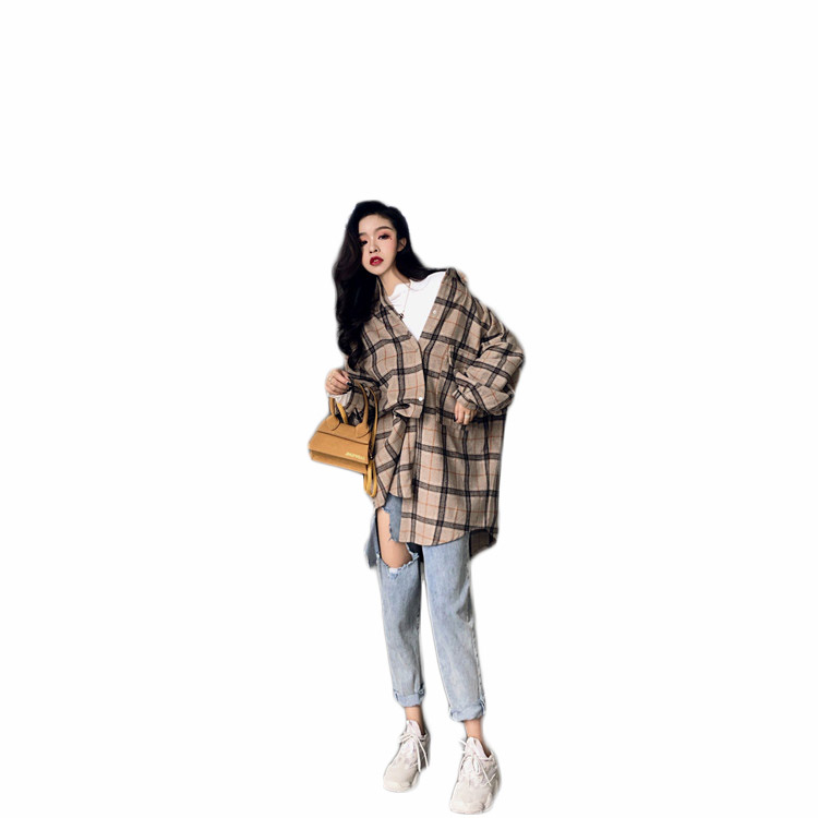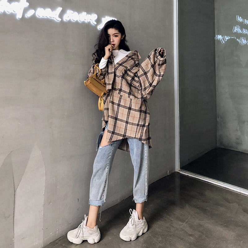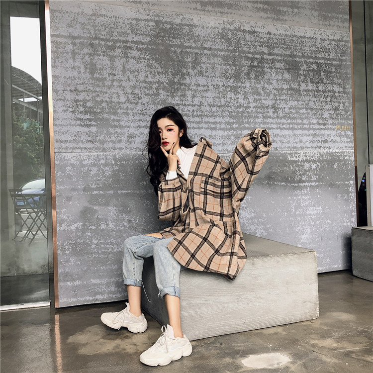 復古港風外套女春秋2018新款韓版百搭款泡泡袖格子慵懶毛呢外套潮