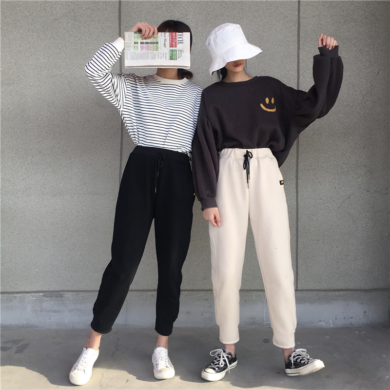 / 秋冬女裝韓版寬松加絨加厚束腳褲哈倫褲高腰休閑褲九分褲學生褲子