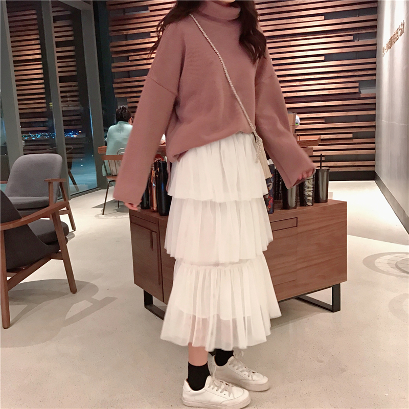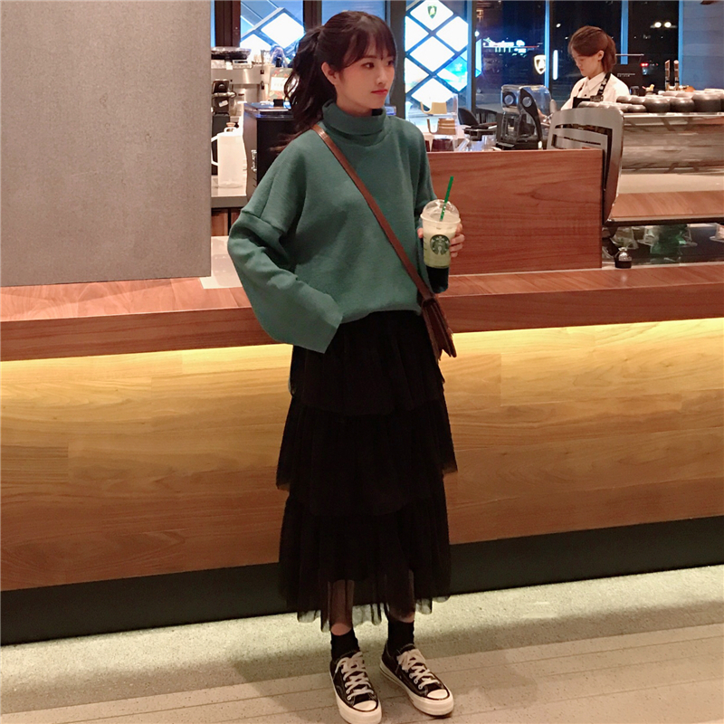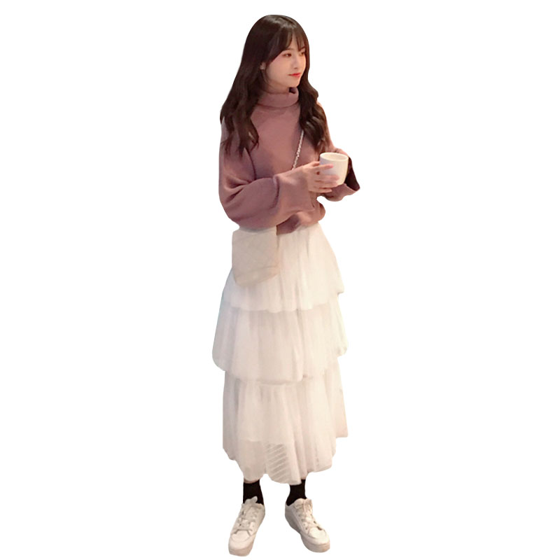 / 韓版時尚休閑套裝秋季女裝高領針織毛衣+網紗蛋糕裙半身裙兩件套