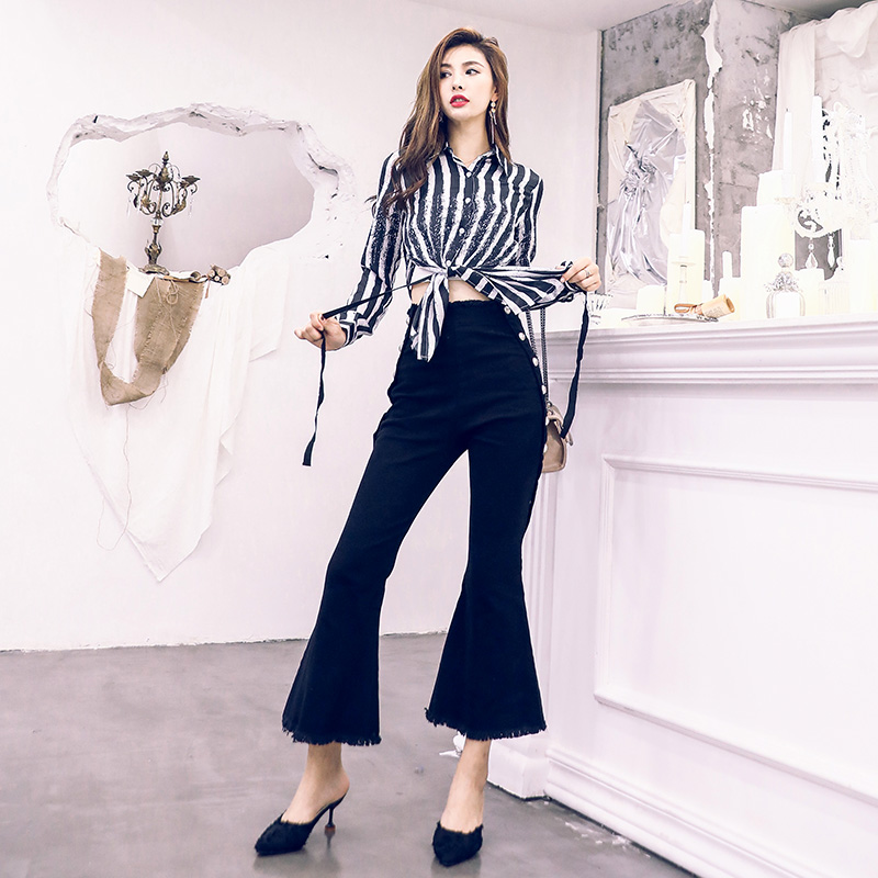 / 名媛氣質2018秋裝新款設計感綁帶條紋襯衫高腰顯瘦喇叭長褲套裝