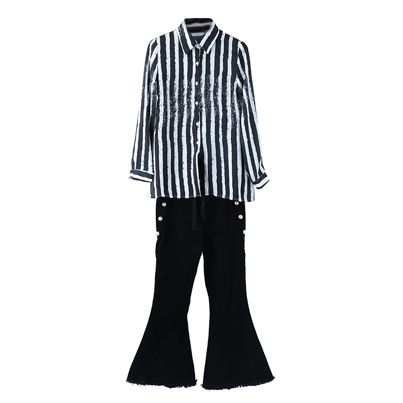 名媛氣質2018秋裝新款設計感綁帶條紋襯衫高腰顯瘦喇叭長褲套裝