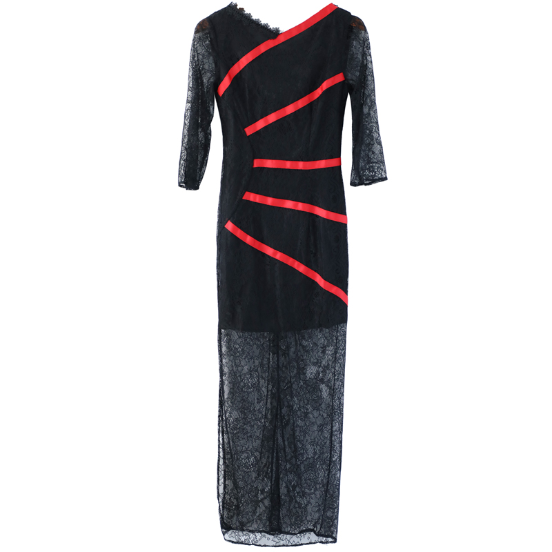 歐洲站時尚名媛氣質性感鏤空蕾絲透視連衣裙修身女神范禮服長裙潮