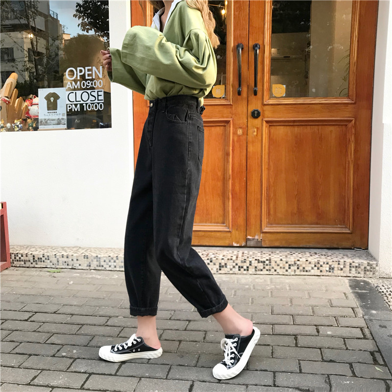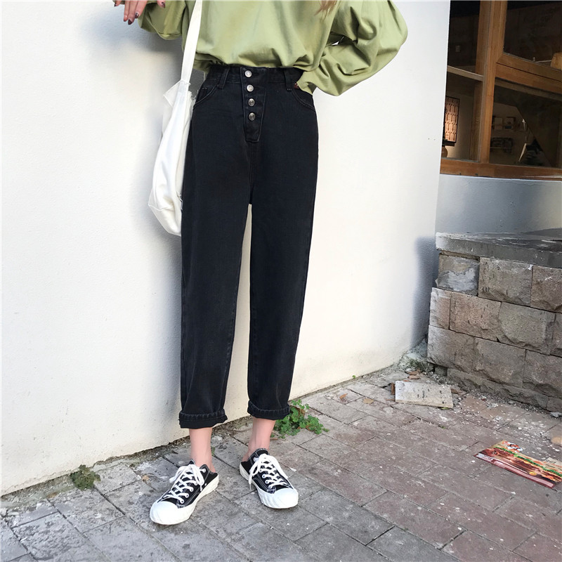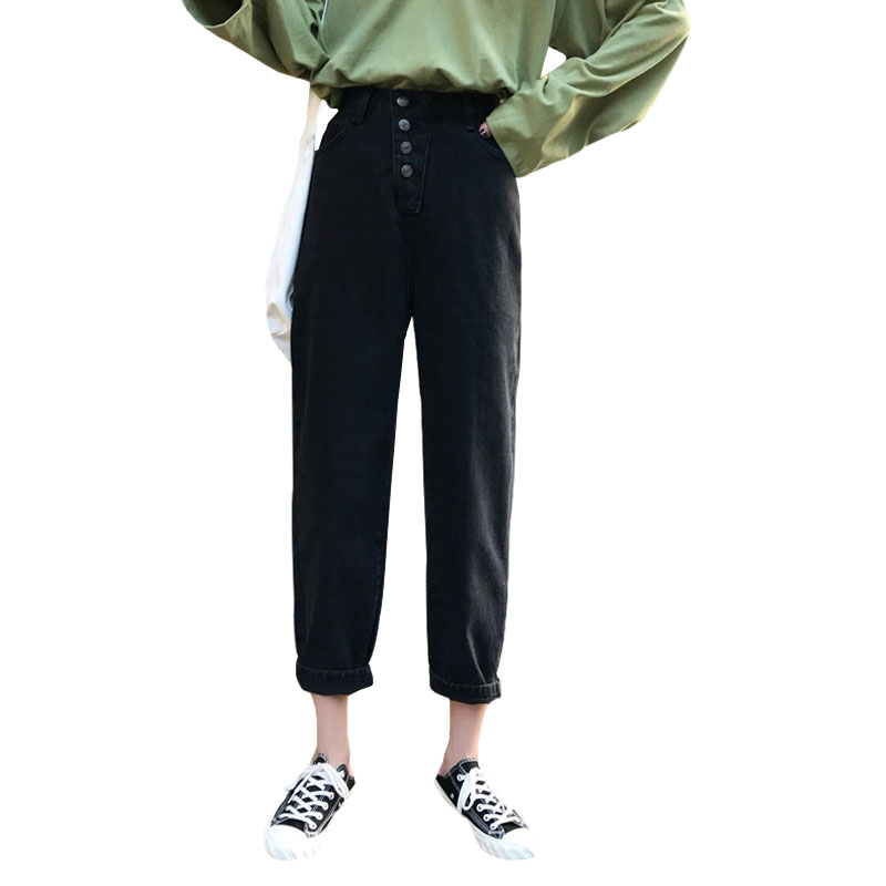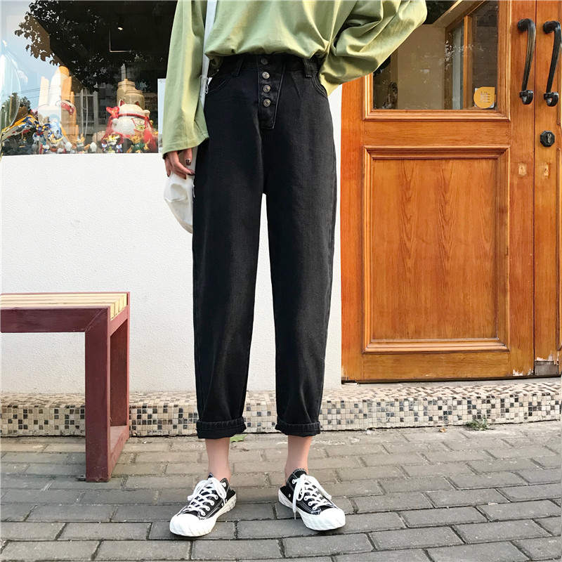 / 秋季女裝韓版黑色高腰闊腿褲牛仔褲單排扣寬松哈倫褲九分褲直筒褲