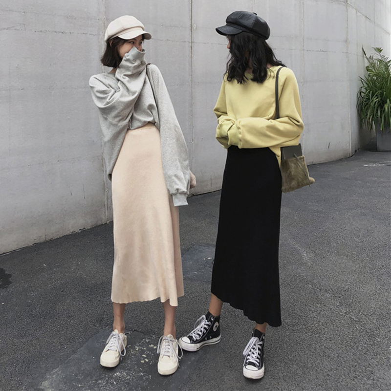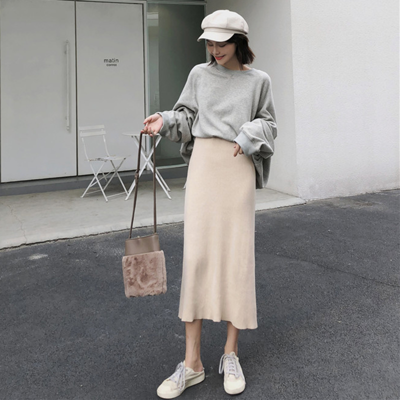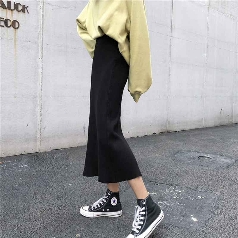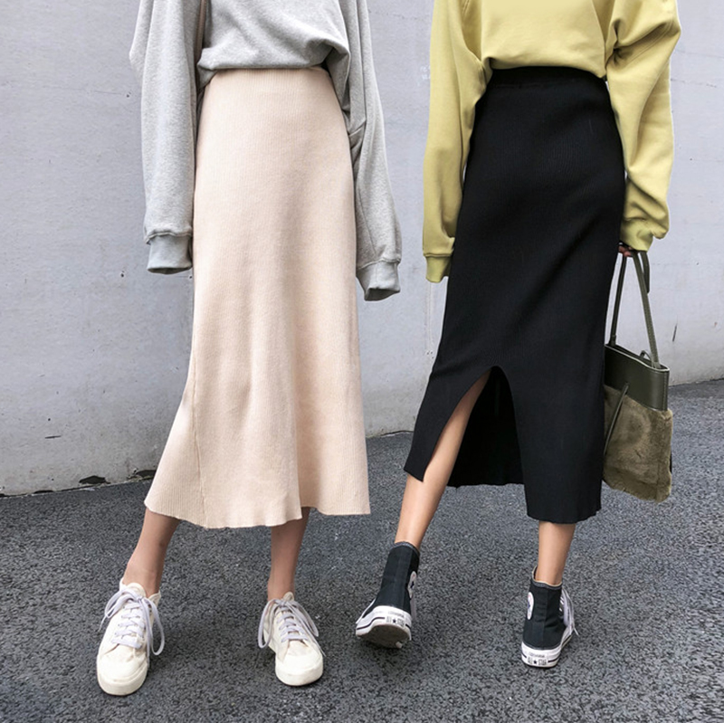 中長款開叉包臀裙子女秋冬裝2018新款韓版氣質高腰A字針織半身裙