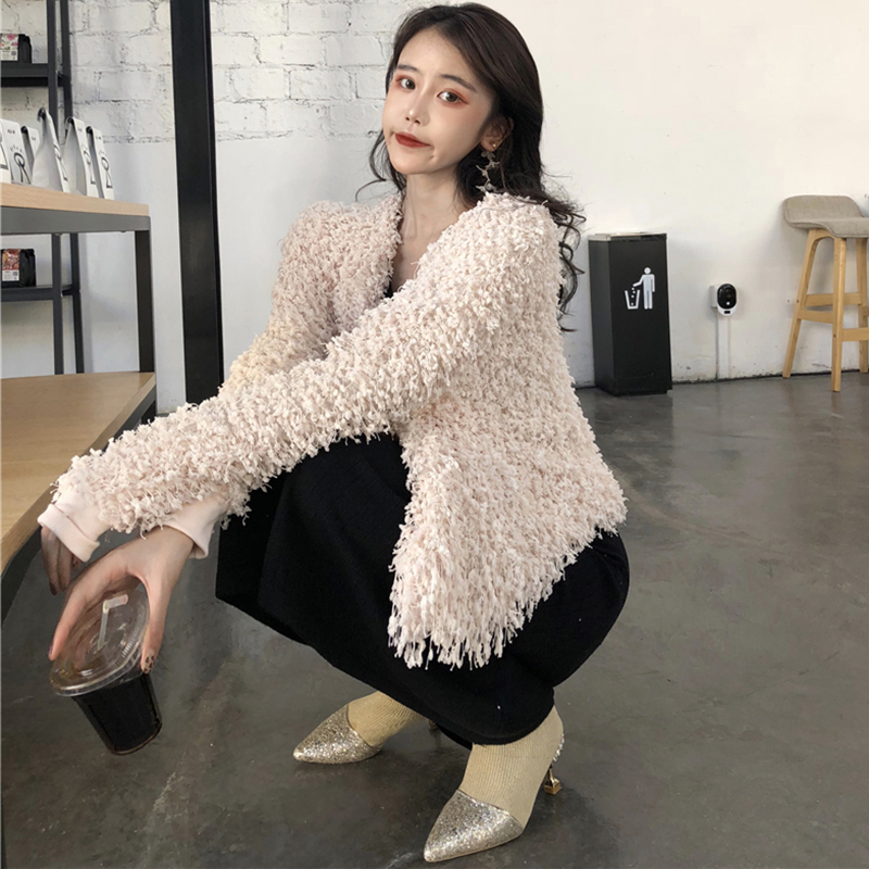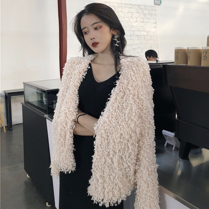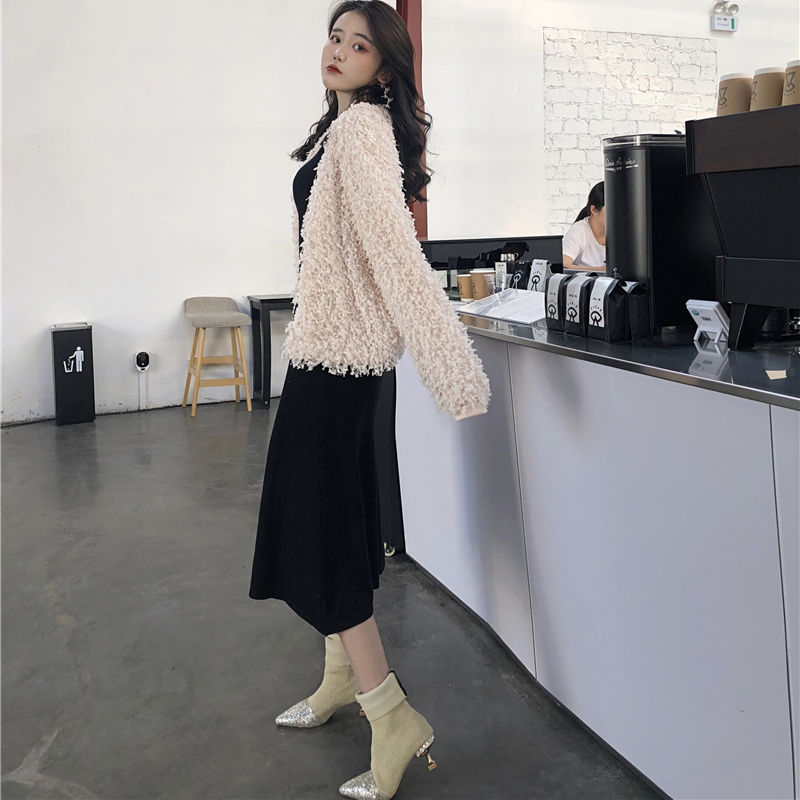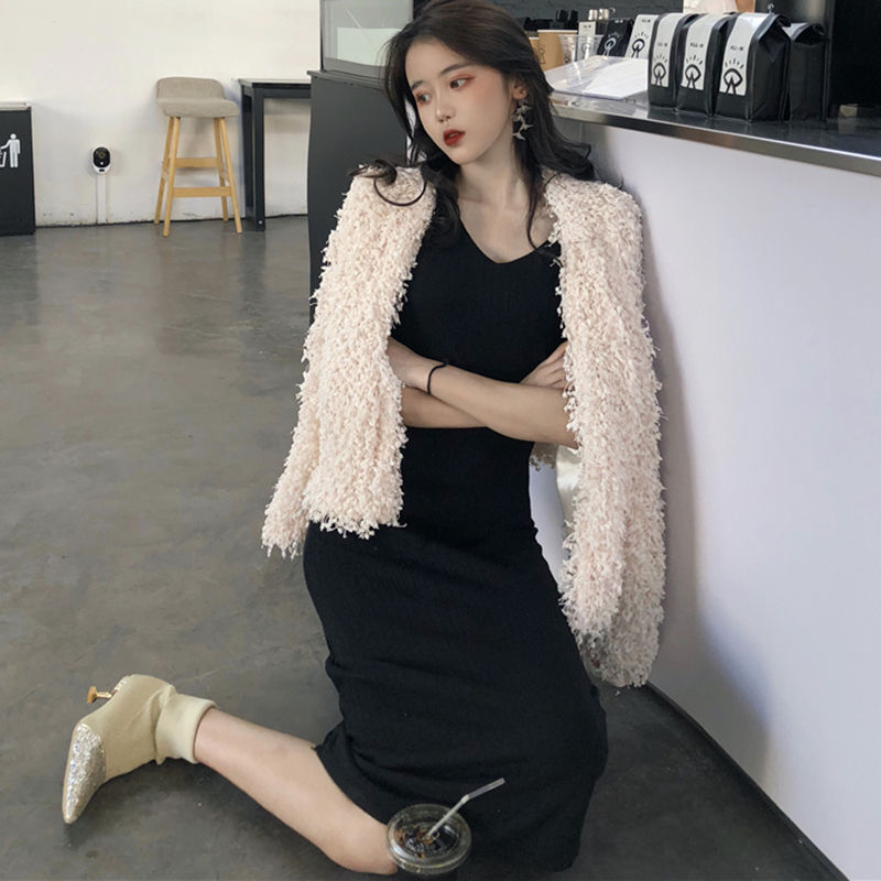 赫本套裝女秋冬新款時尚毛毛開衫短外套修身黑色針織吊帶連衣裙子