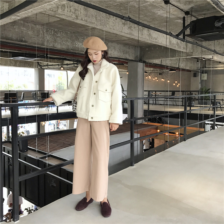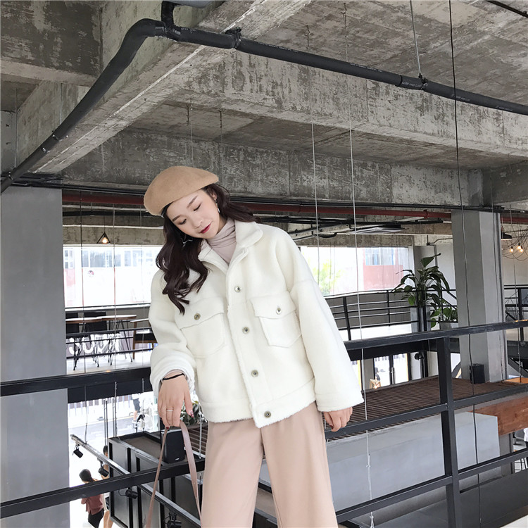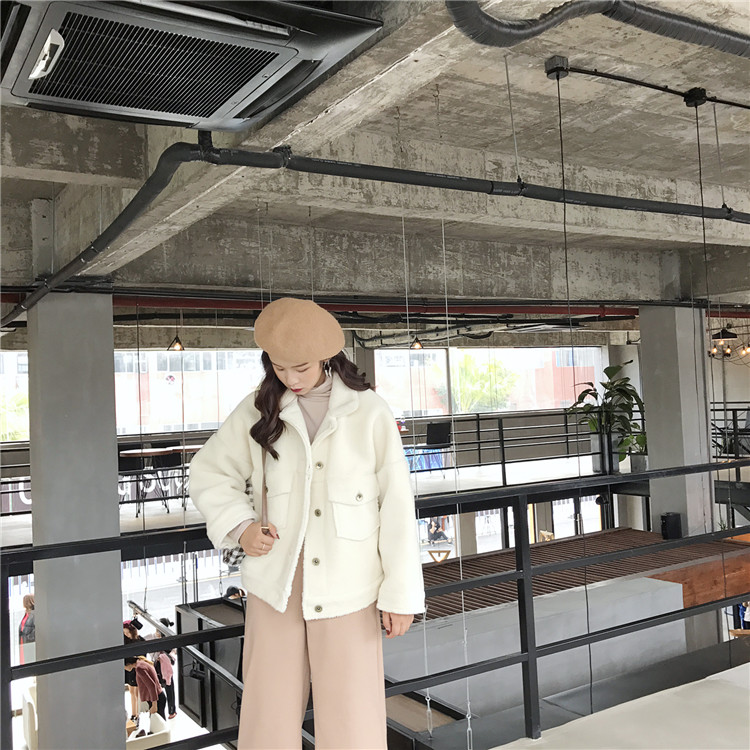 復古韓版新款女裝冬季短款加厚保暖羊羔毛翻領外套女時尚百搭絨衫