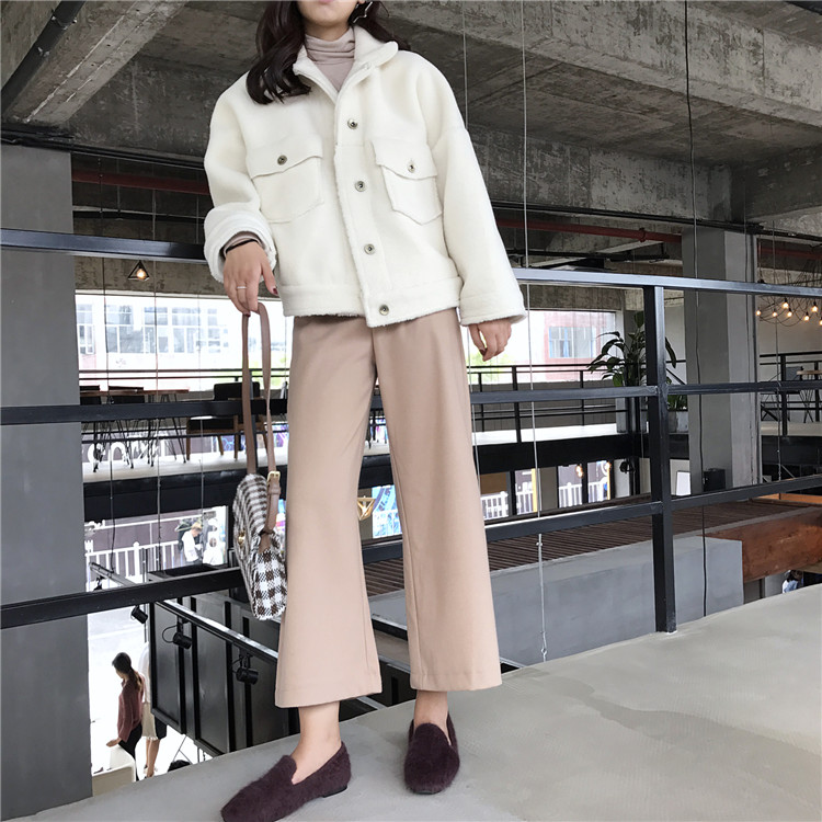 外套女秋裝2018新款復古溫柔慵懶杏色立領單排扣短款羊羔毛外套潮