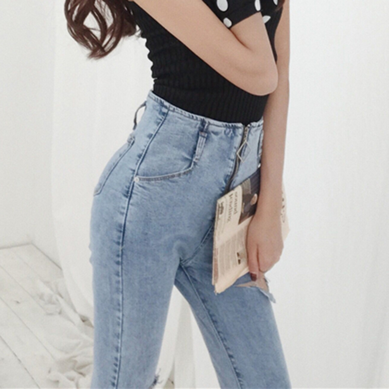 / 九分褲女夏新款韓版女裝拉鏈高腰修身鉛筆褲不規則褲腳破洞牛仔褲