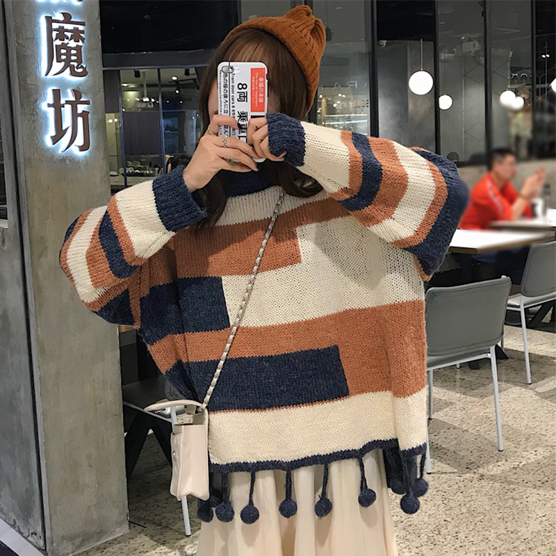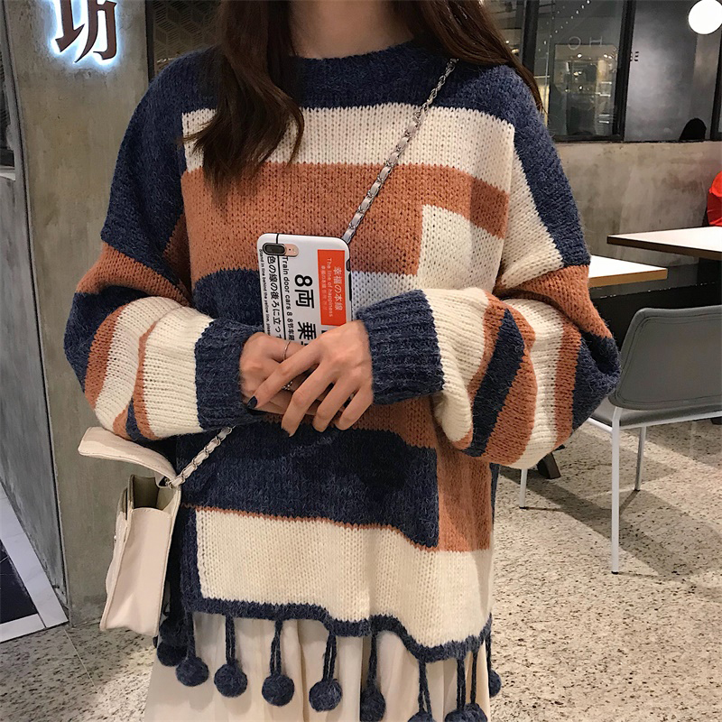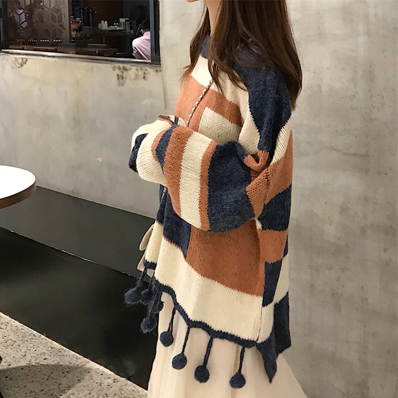 / 韓版拼色流蘇寬松毛衣女秋冬裝2018新款學生時尚針織外套慵懶上衣
