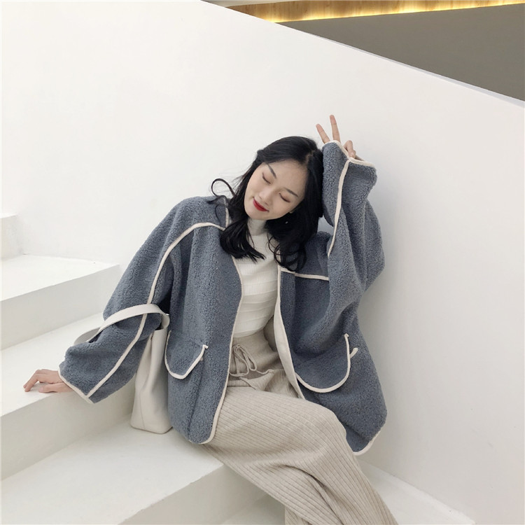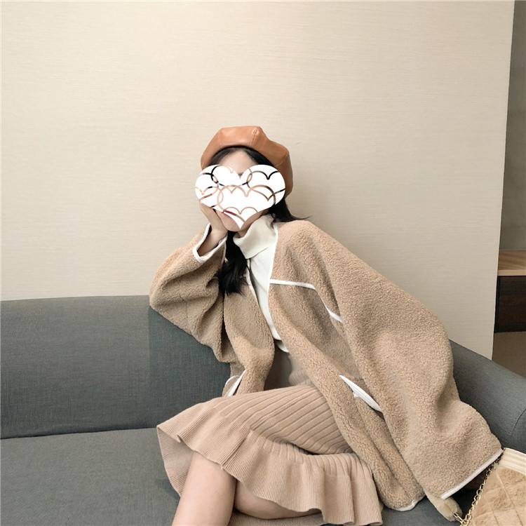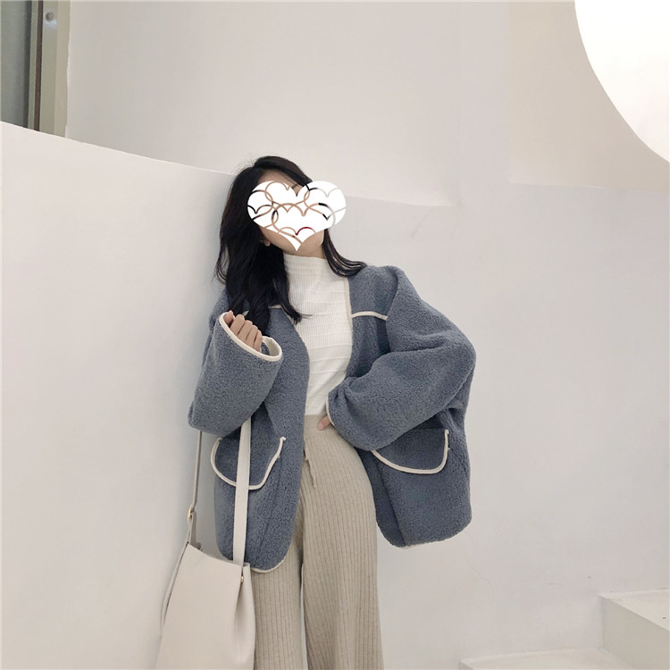 港味冬季加厚撞色條邊羊羔毛拼鹿皮絨百搭寬松保暖長袖外套女新款