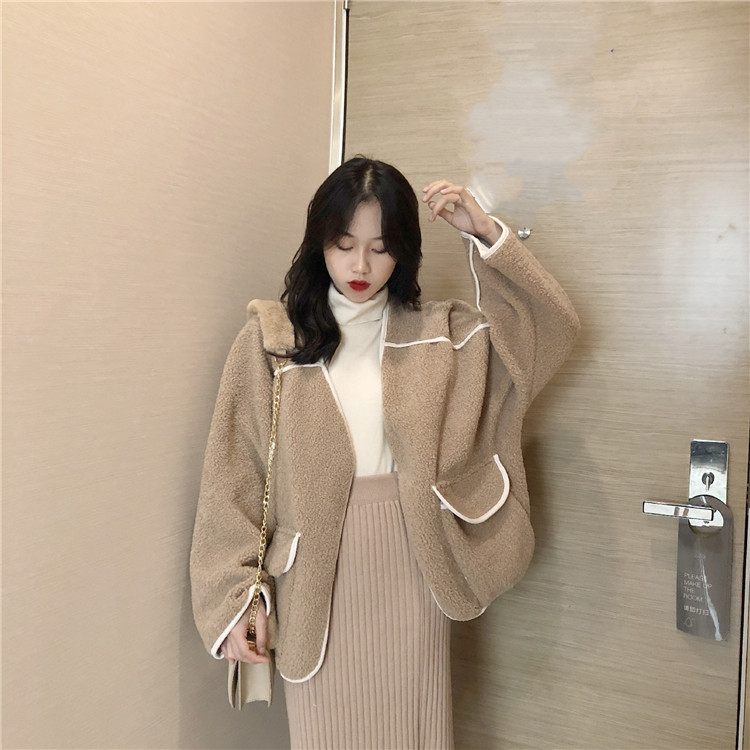 復古韓版新款女裝冬季短款加厚保暖羊羔毛翻領外套女時尚百搭絨衫