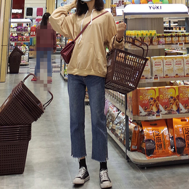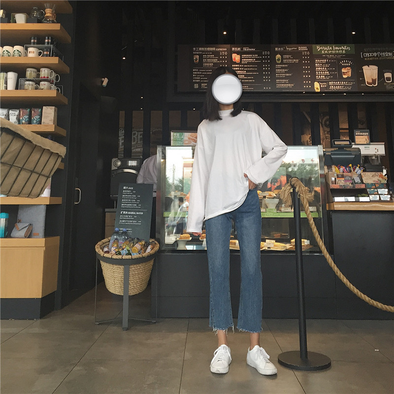 秋季女裝韓版須線刺繡直筒褲高腰開叉牛仔褲寬松顯瘦闊腿褲九分褲