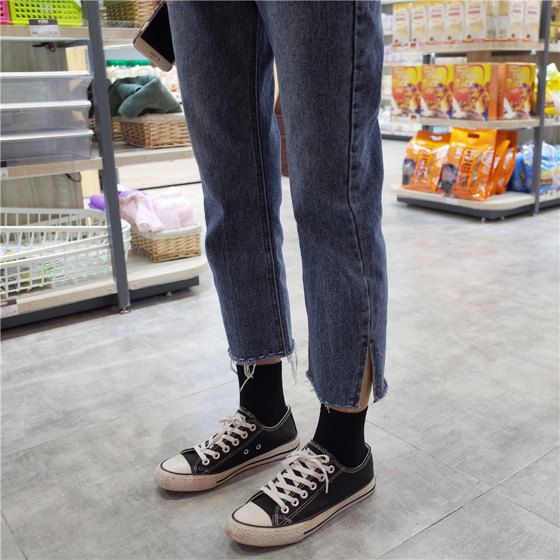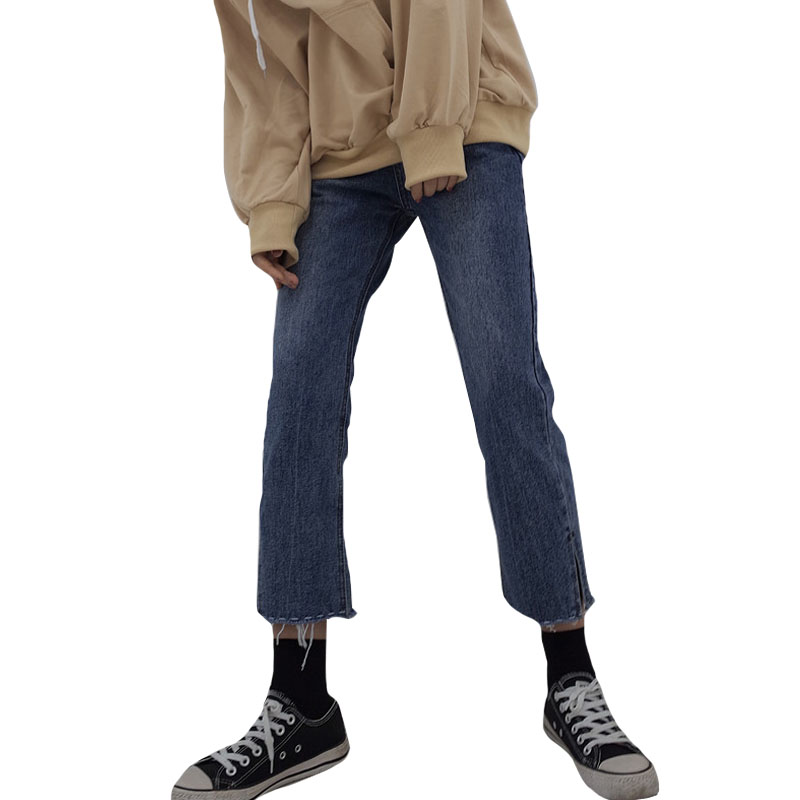 / 秋季女裝韓版須線刺繡直筒褲高腰開叉牛仔褲寬松顯瘦闊腿褲九分褲