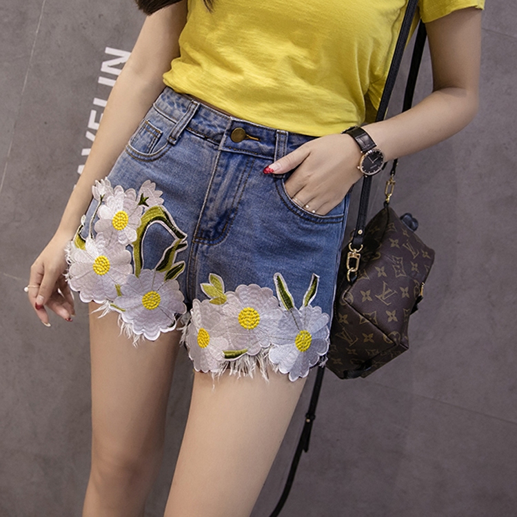 牛仔短褲女韓版夏高腰刺繡短褲繡花顯瘦闊腿褲毛邊花朵破洞熱褲