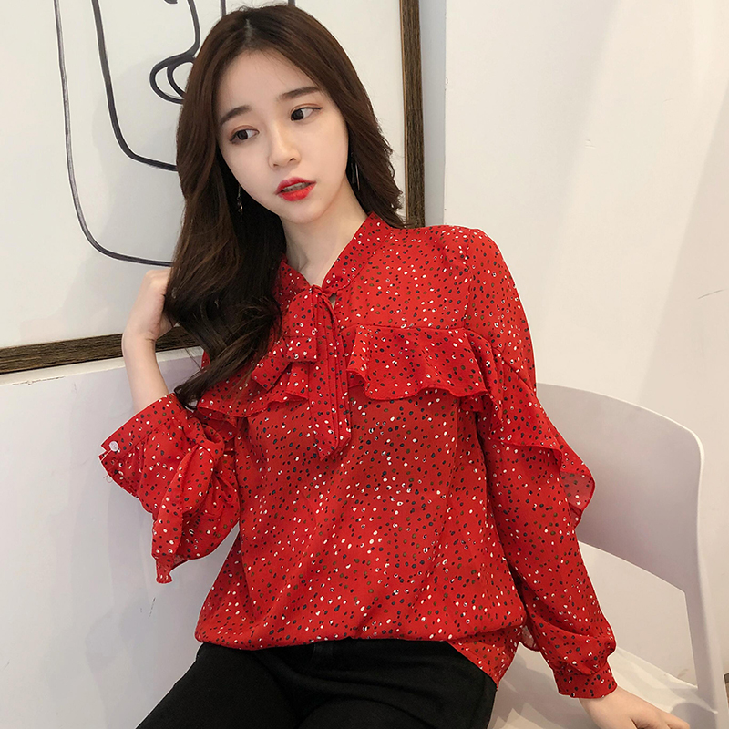 襯衫女初秋新款女裝韓版寬松系帶蝴蝶結長袖上衣荷葉邊碎花雪紡衫