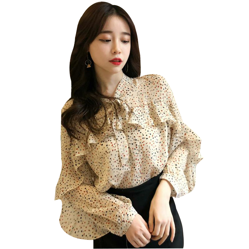 / 襯衫女初秋新款女裝韓版寬松系帶蝴蝶結長袖上衣荷葉邊碎花雪紡衫