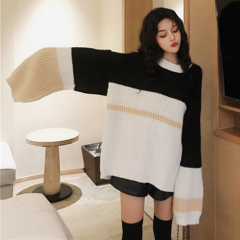 / 學生寬松毛衣女秋冬裝2018新款慵懶針織外套時尚拼色休閑長袖上衣