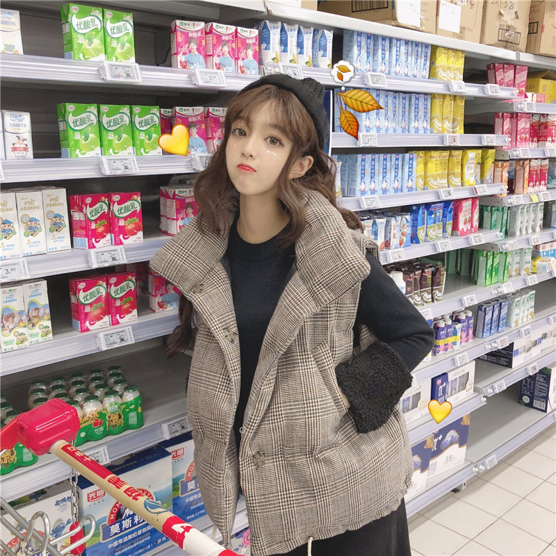 / 2018新款秋冬女裝韓版學院風復古寬松格子棉衣面包服馬甲背心外套