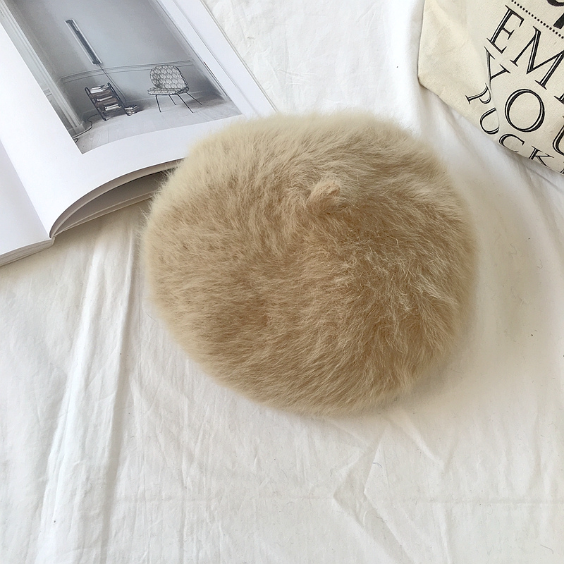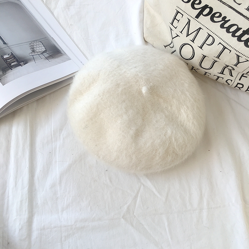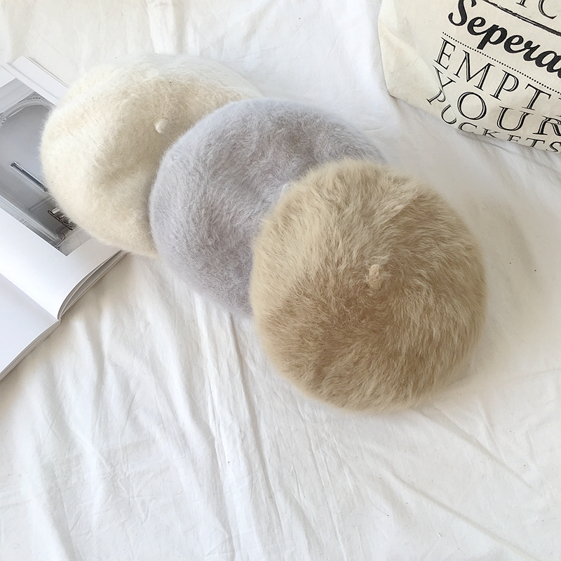 秋冬新款韓版復古chic風蓓蕾帽甜美純色加厚清新針織兔毛貝雷帽女