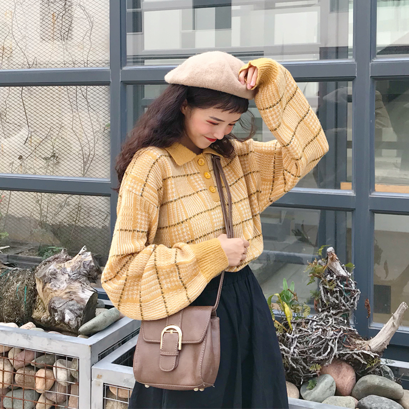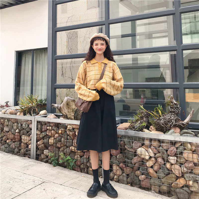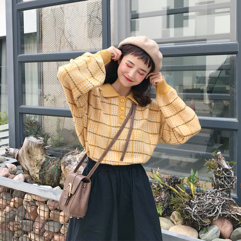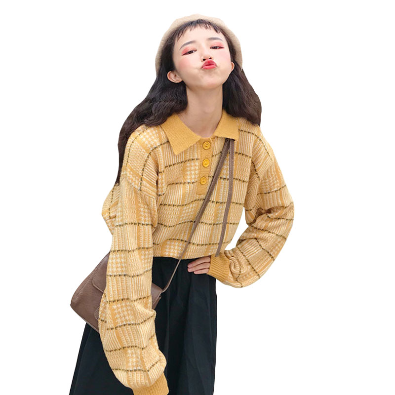 / 秋季女裝韓版BF風寬松POLO領黃色格紋毛衣長袖打底衫針織衫上衣潮