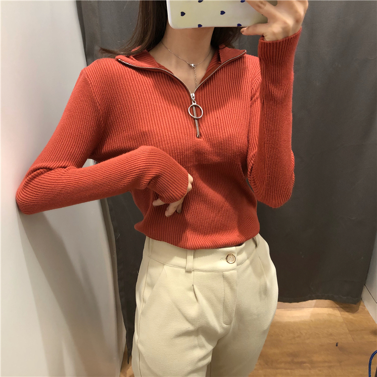 / 韓版chic早秋毛衣慵懶風氣質半高領圓環拉鏈修身長袖打底針織衫潮