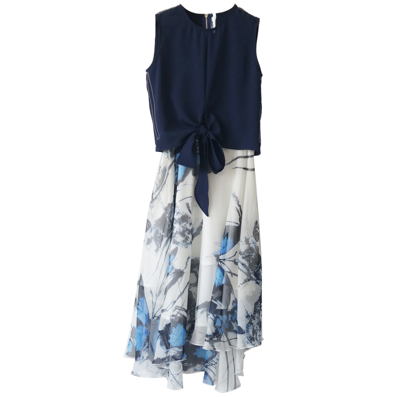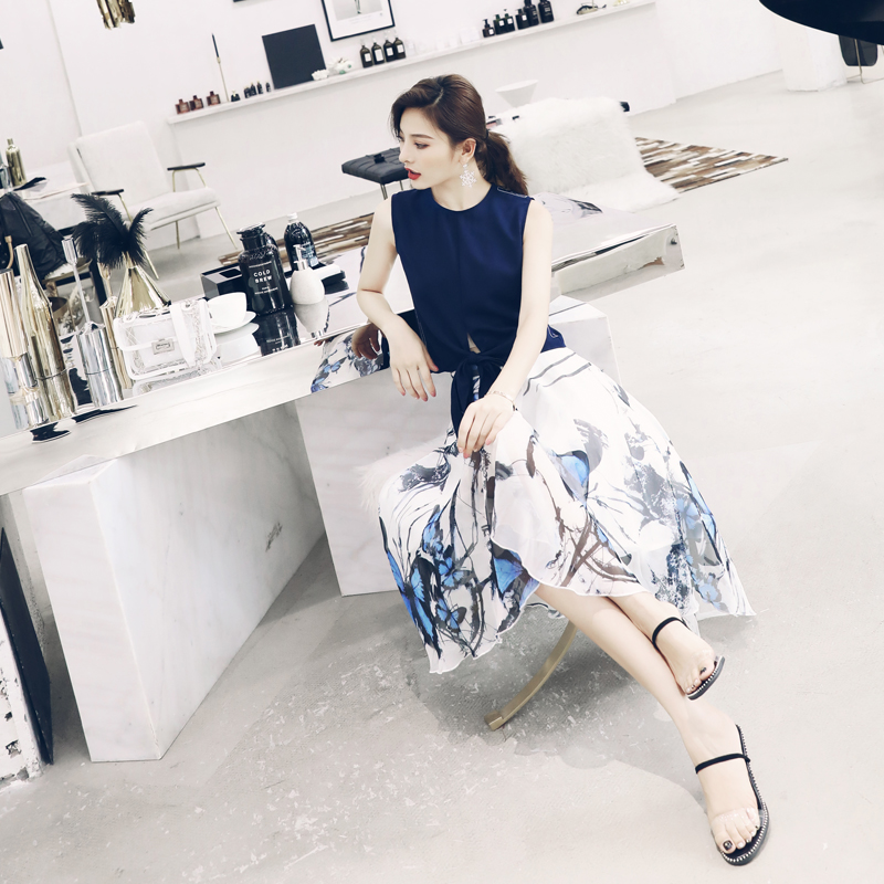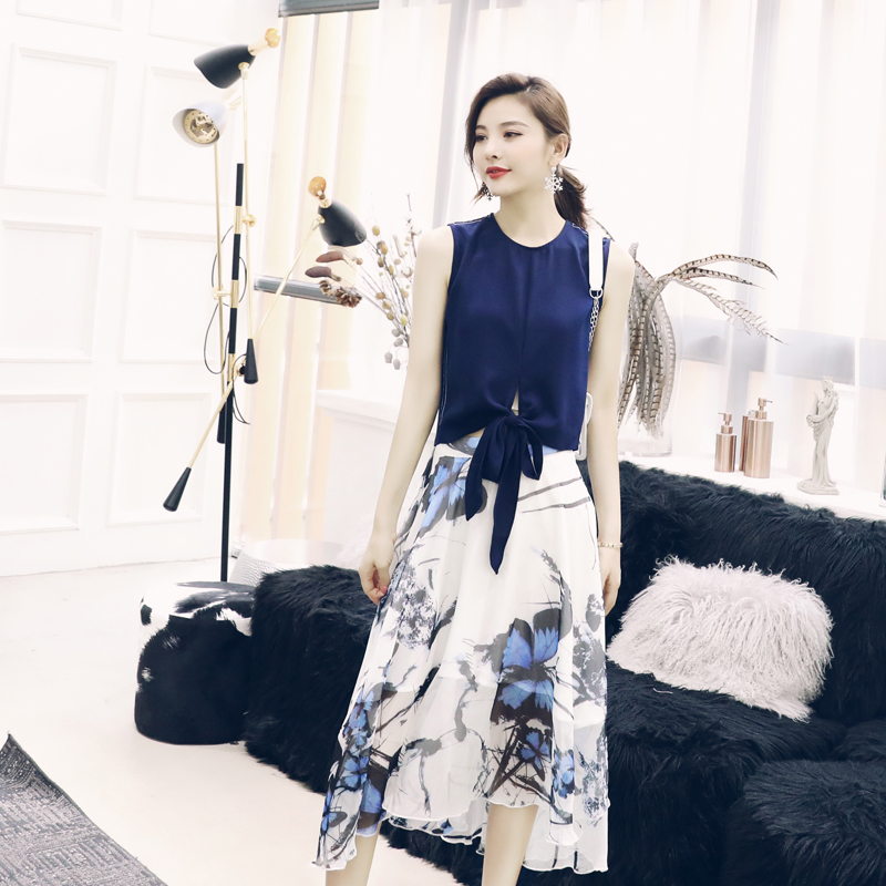 / 名媛氣質港味夏季韓版無袖蝴蝶結T恤高腰印花修身半身中長裙套裝