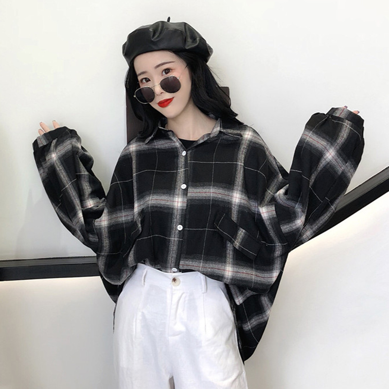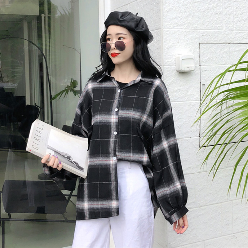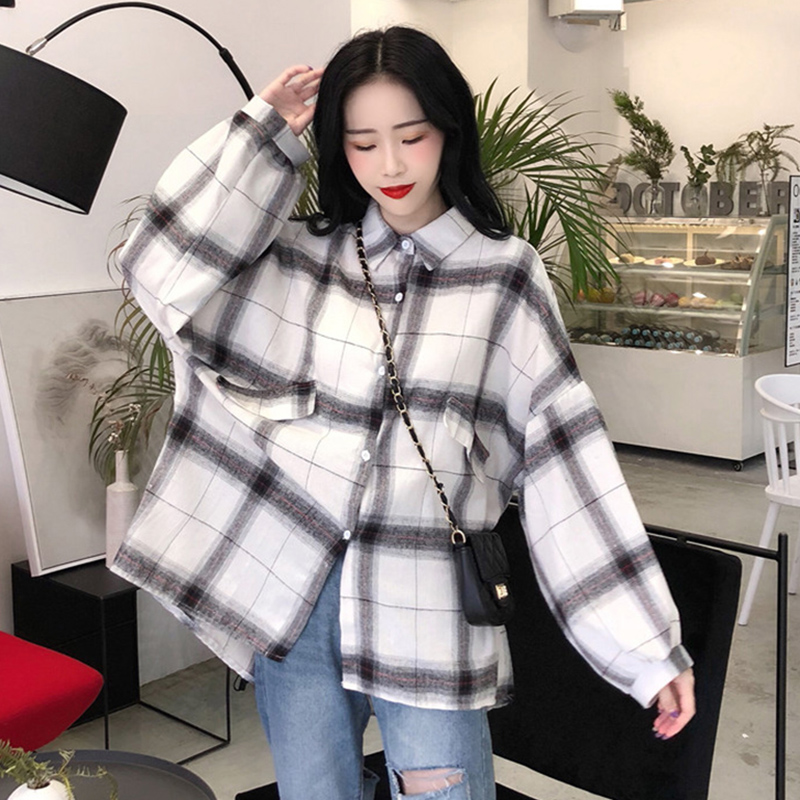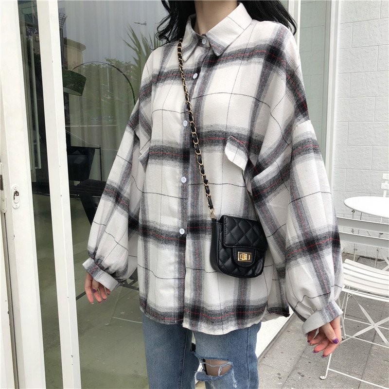 格子襯衫女2018秋裝新款復古港味寬松泡泡長袖上衣時尚慵懶薄外套