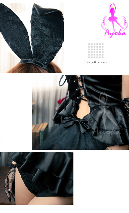 。規格尺寸: ◆ 內容物:綁繩短上衣x1+造型內褲x1+兔耳髮箍x1+黑蕾絲短手套x1