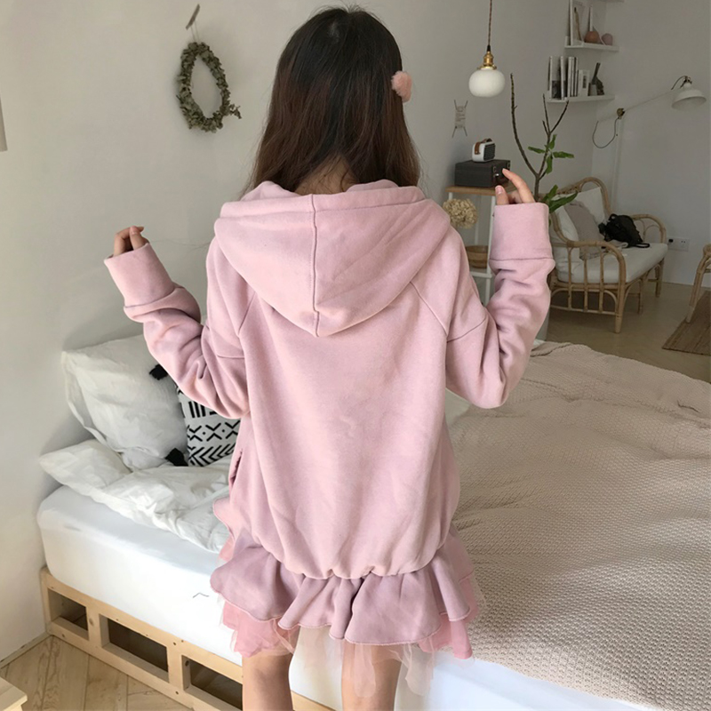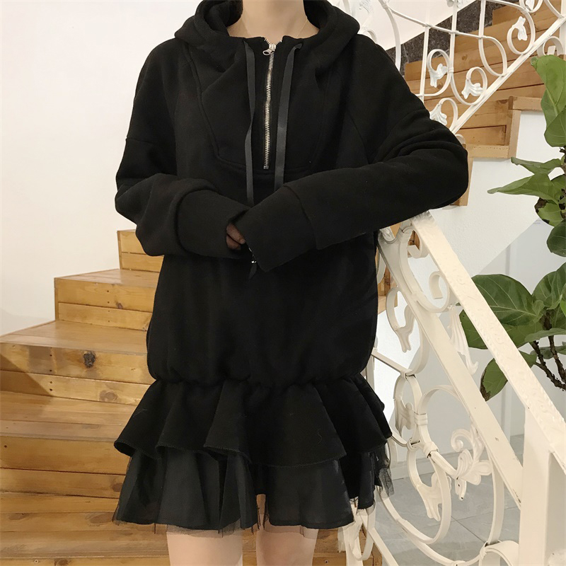 / 復古法式荷葉邊連衣裙子女秋冬裝新款網紗拼接時尚長袖連帽衛衣裙