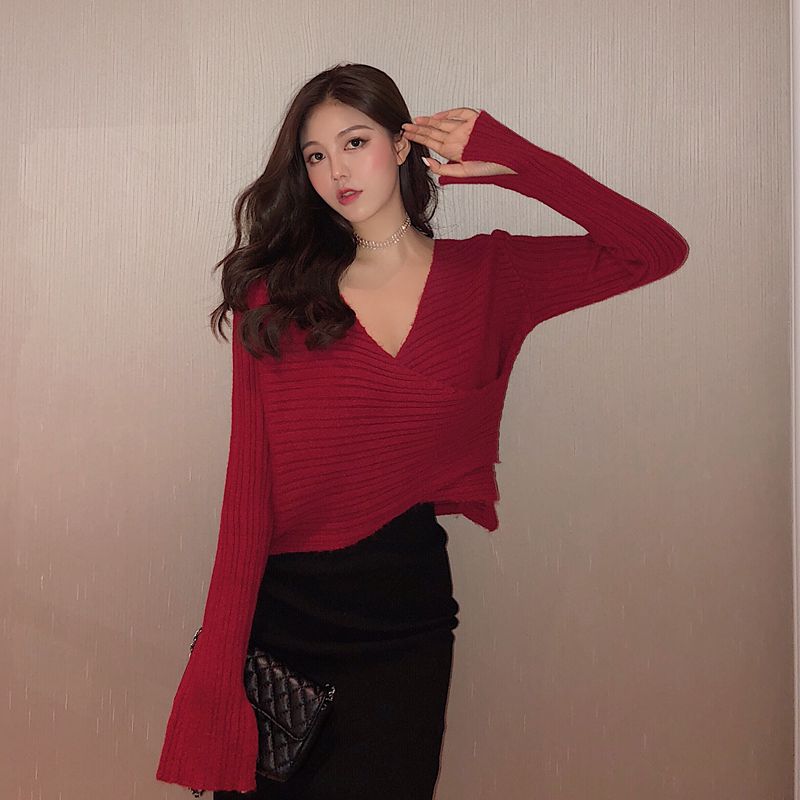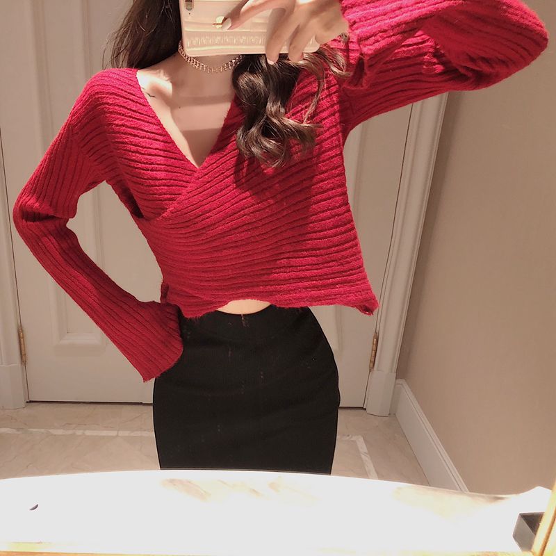 / 復古chic百搭新款時尚顯瘦秋裝寬松長袖針織衫女交叉V領短款毛衣
