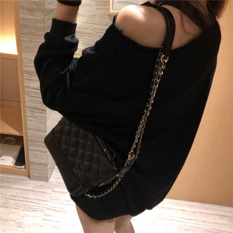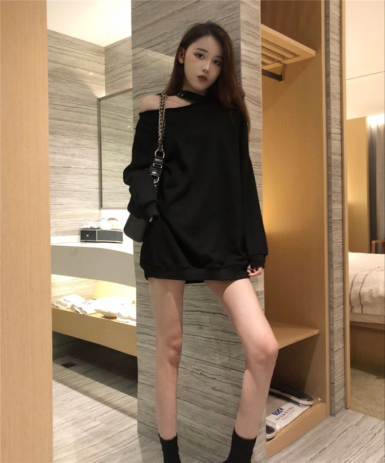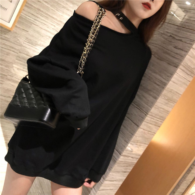 港味網紅同款小心機寬松中長款百搭秋裝新款上衣掛脖露肩長袖衛衣
