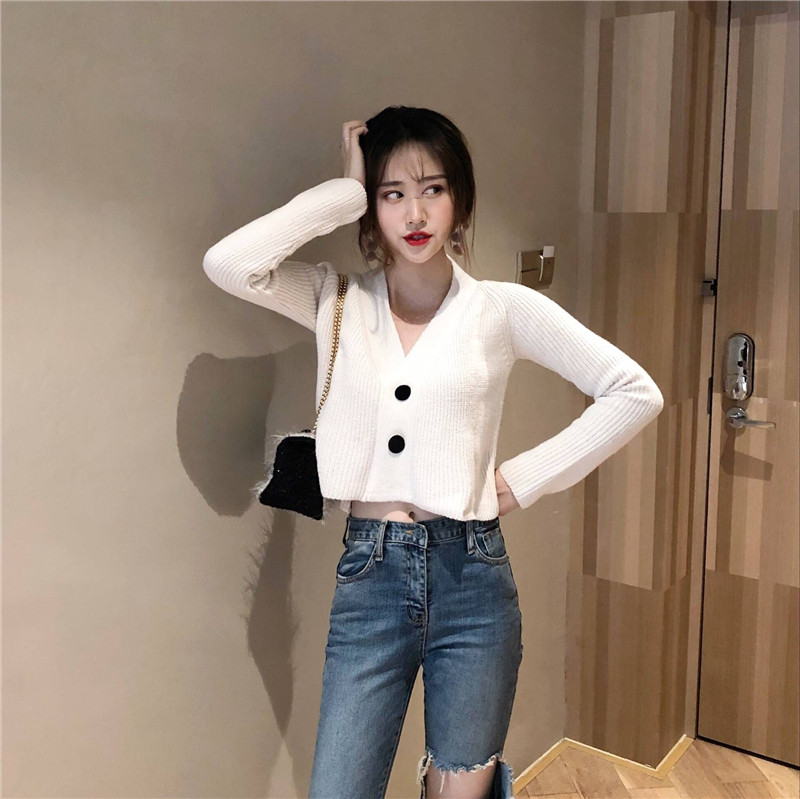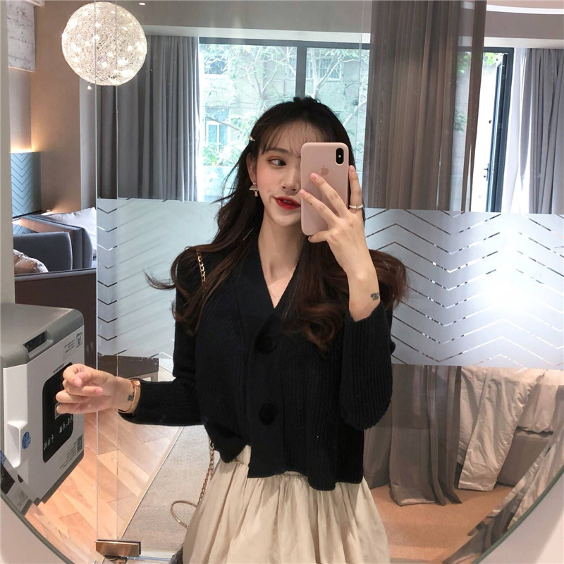 韓版寬松百搭V領針織開衫秋季毛衣外搭氣質長袖高腰短款小外套潮