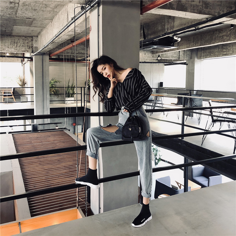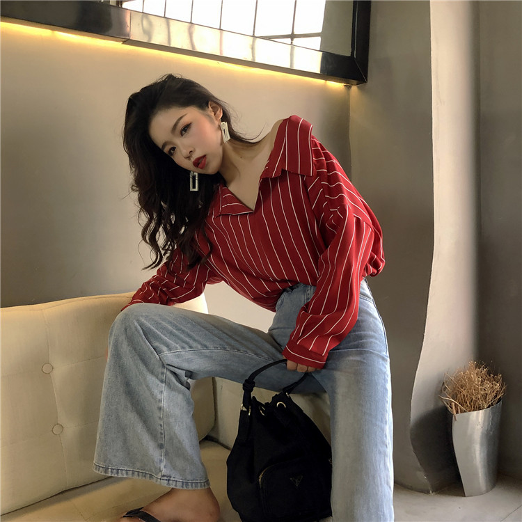 / 港風顯瘦V領條紋時尚簡約氣質百搭洋氣上衣薄款襯衫女夏2018新款