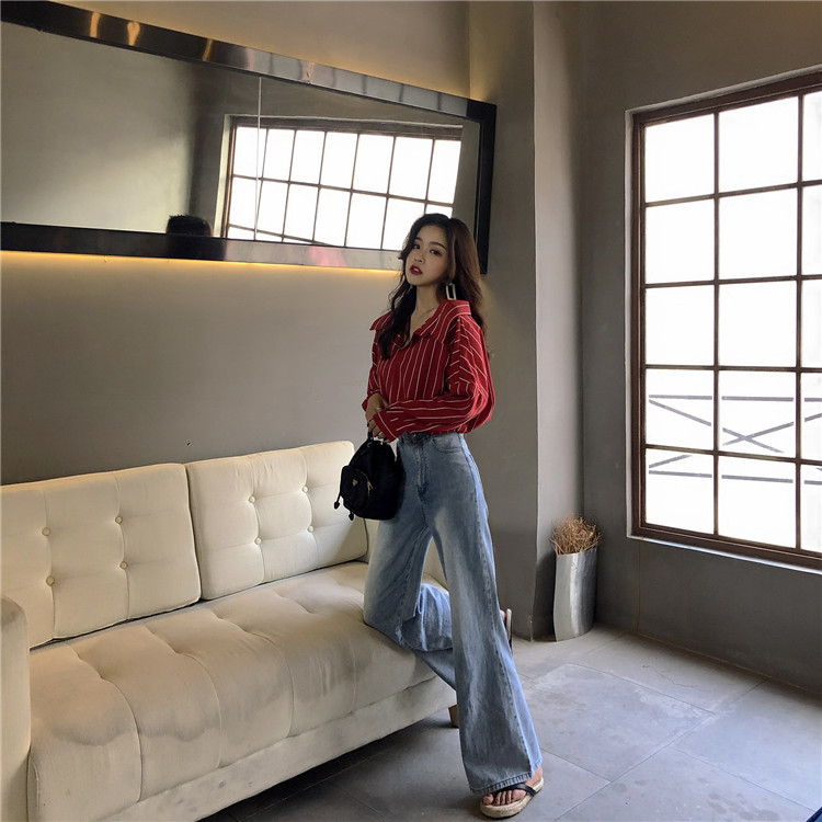 韓版襯衣女2018新款時尚港風翻領條紋修身顯瘦大口袋經典長袖襯衫