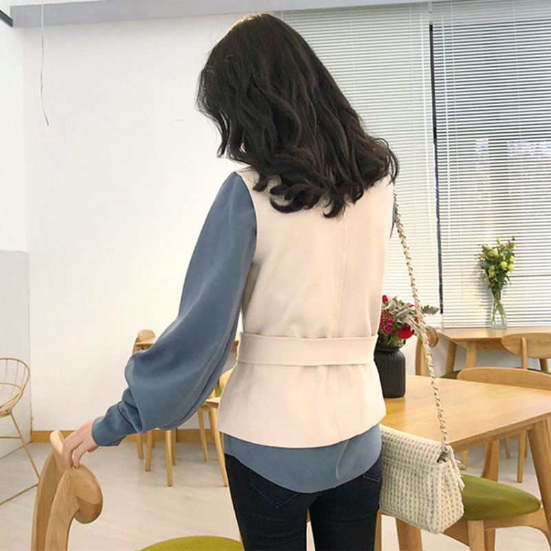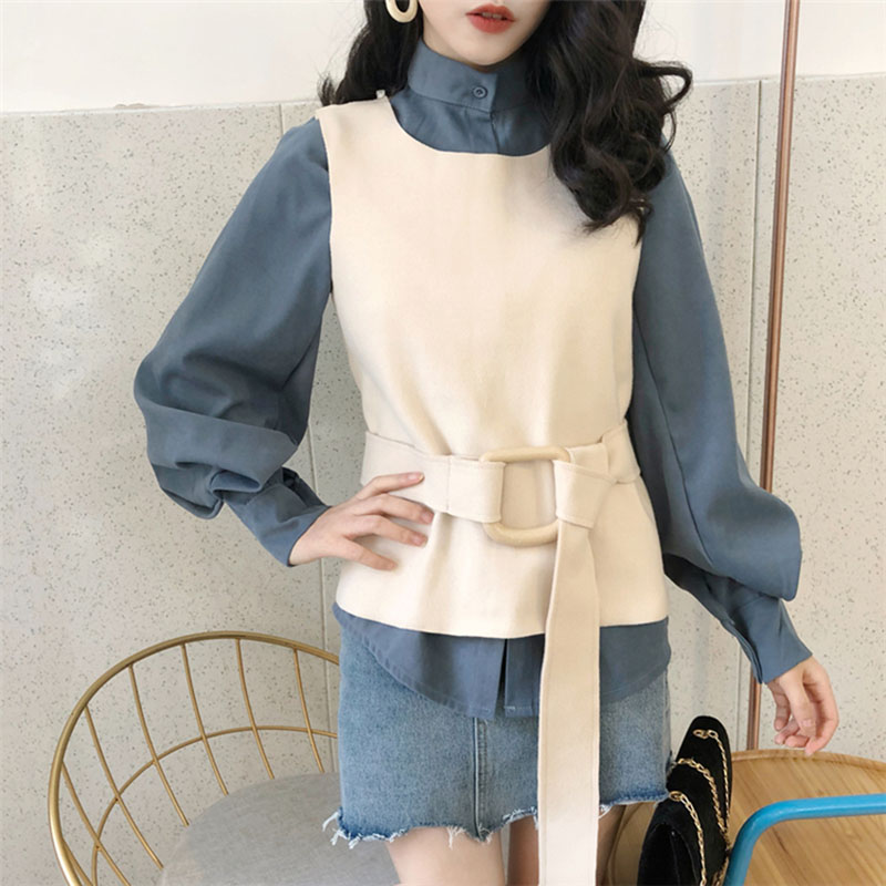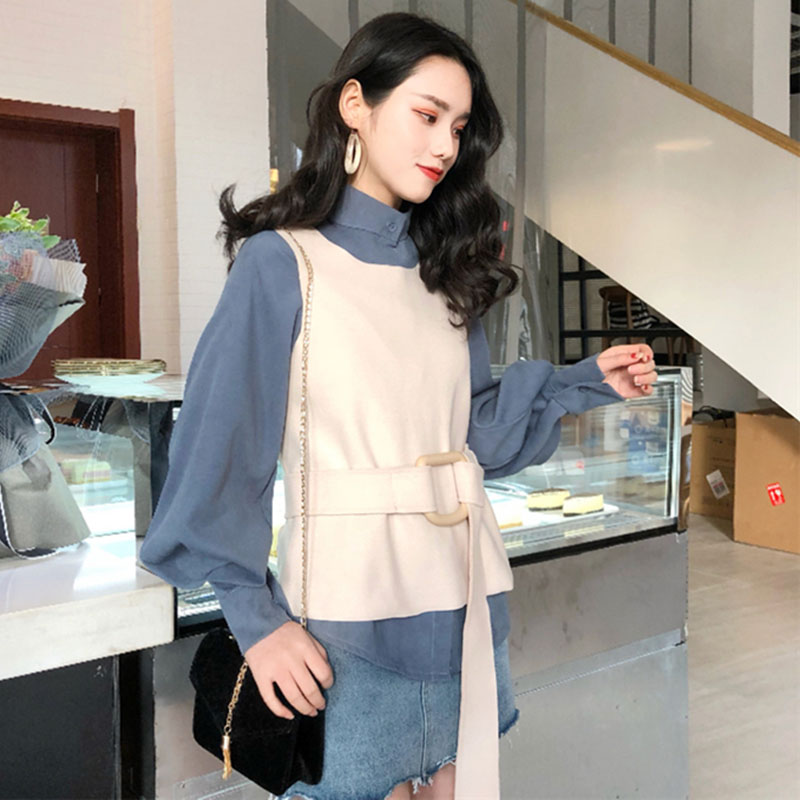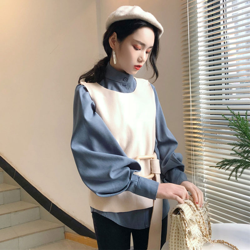 / 港味復古兩件套女秋裝新款泡泡袖襯衫寬松上衣毛呢綁帶馬甲短背心