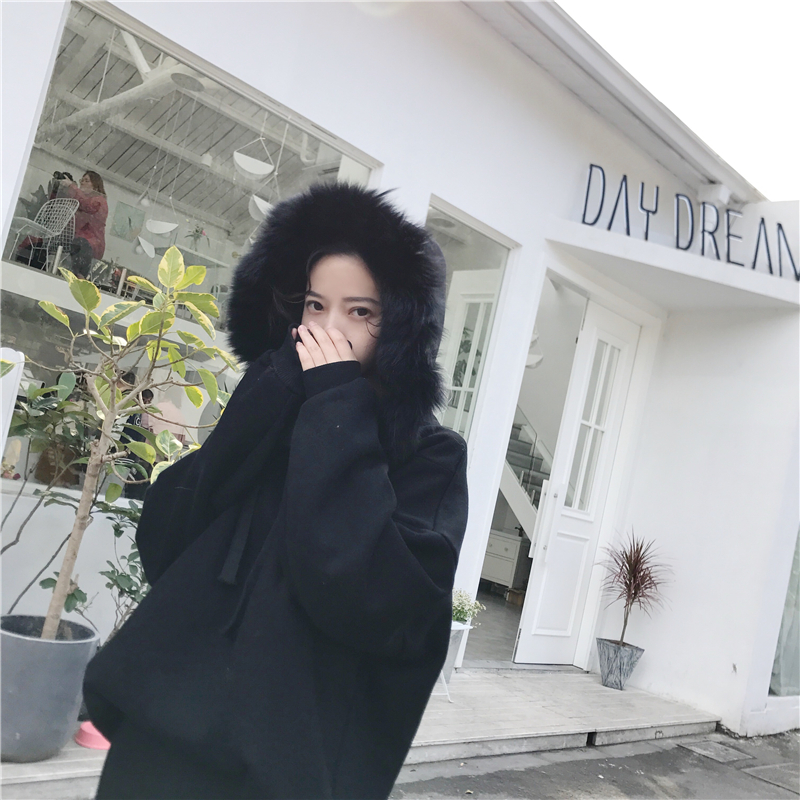 2018秋冬新款韓版純色寬松上衣女chic毛毛領加絨加厚百搭連帽衛衣