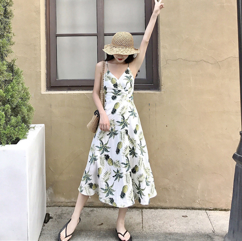 夏裝2018新款女溫柔氣質菠蘿顯瘦印花長裙百搭交叉露背吊帶連衣裙