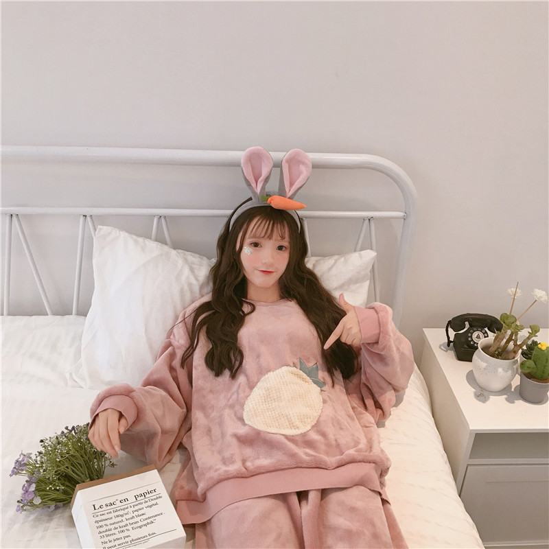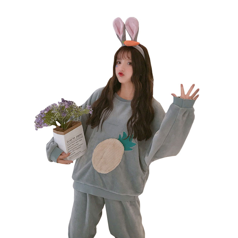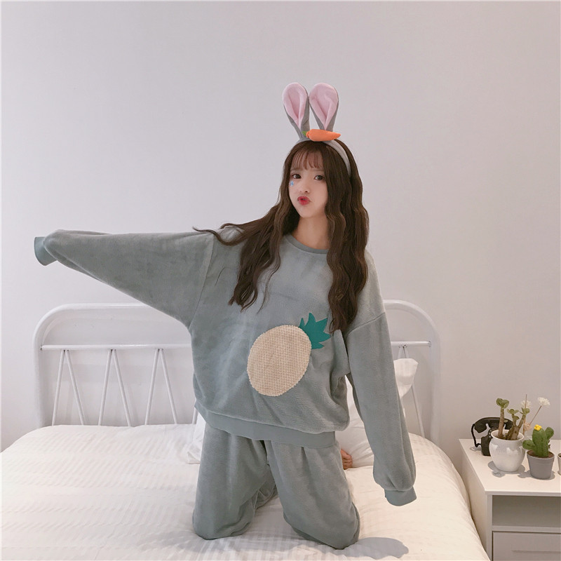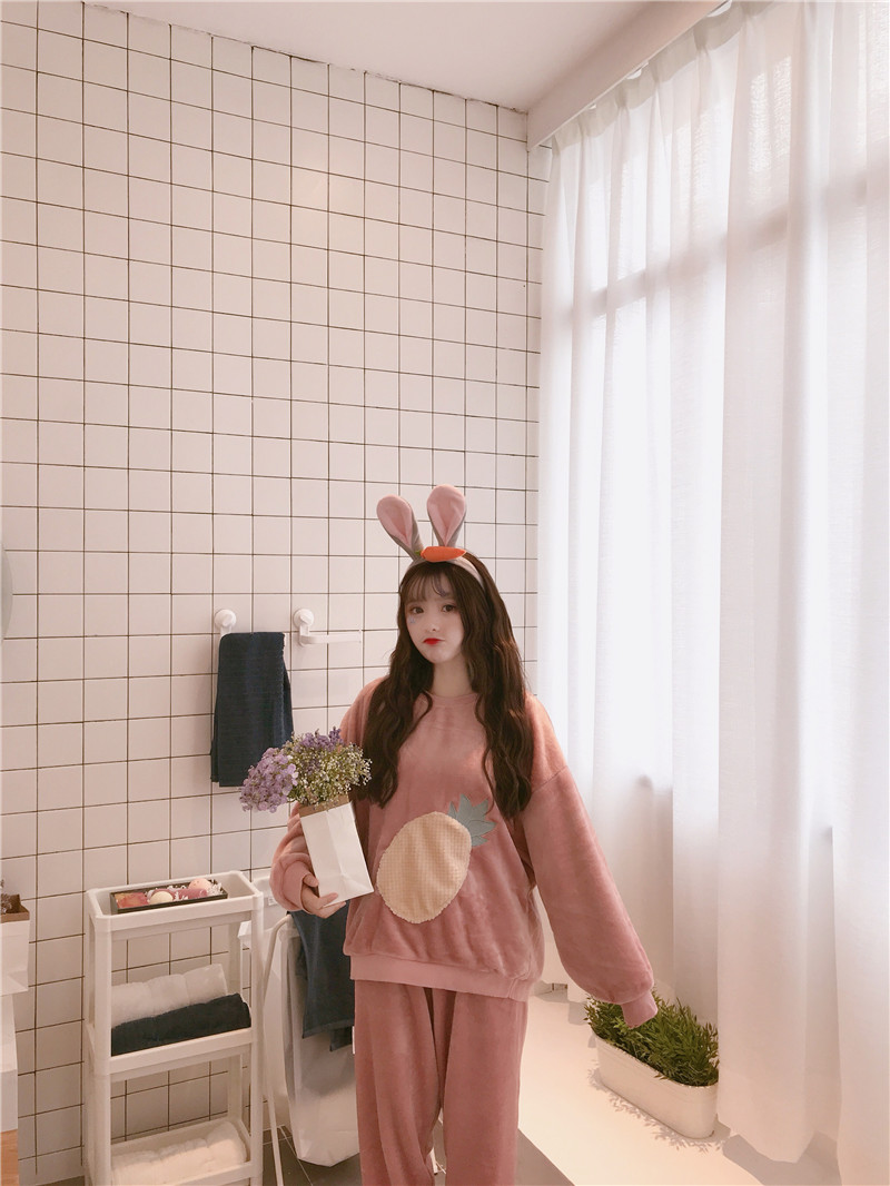 / 秋冬女裝韓版甜美刺繡菠蘿加絨加厚長袖睡衣睡褲兩件套家居服套裝