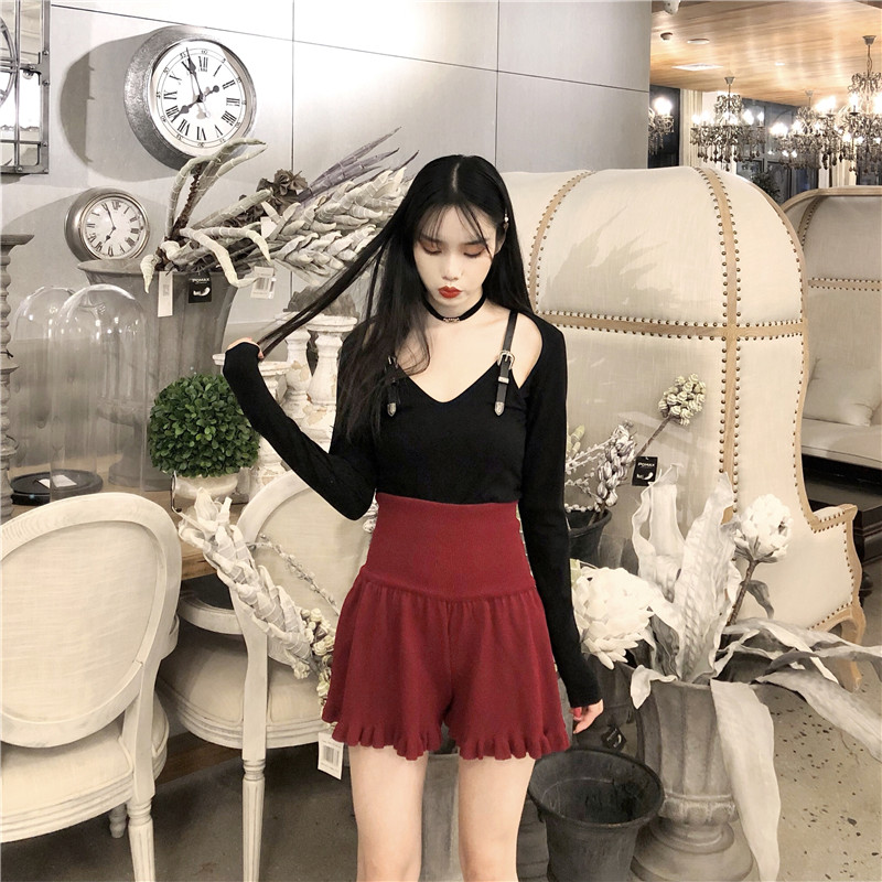/ 韓國復古風女神套裝秋冬款修身顯瘦皮帶拼接打底衫+高腰針織褲裙