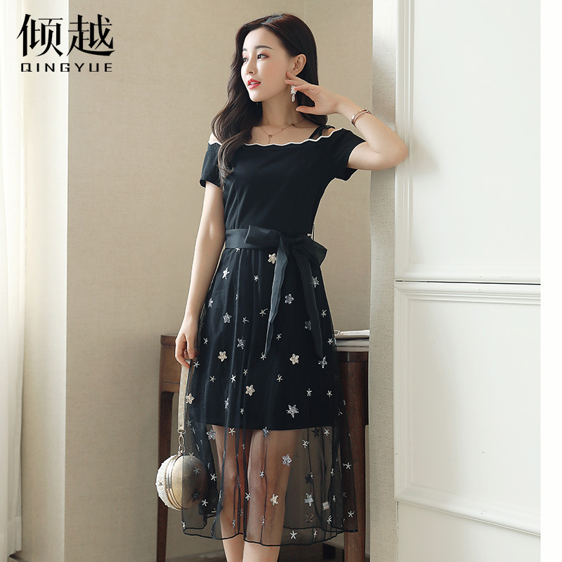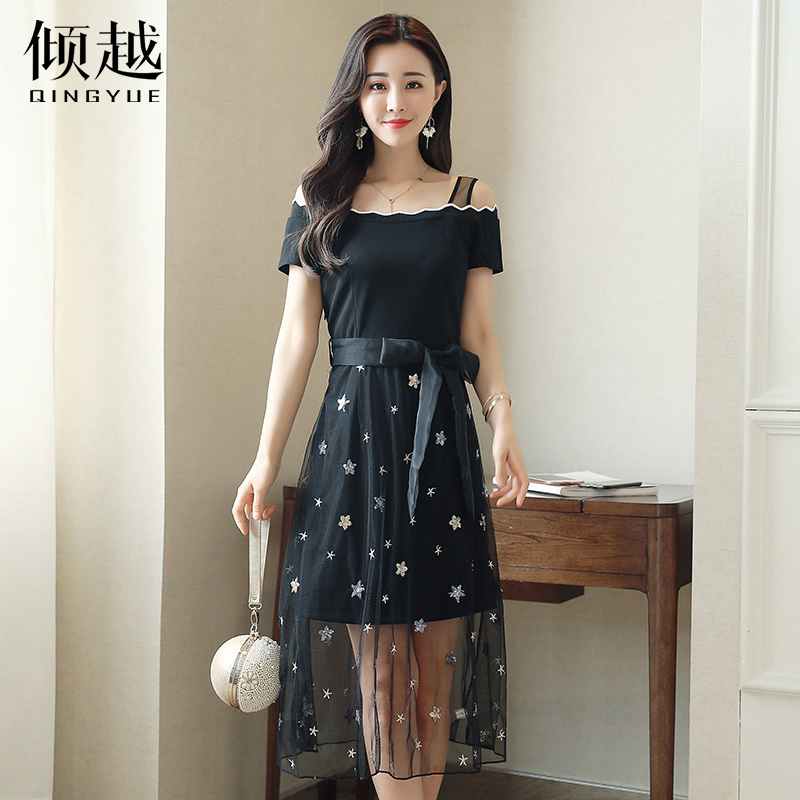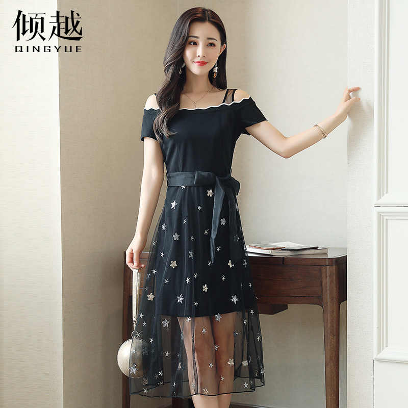 / 裙子女夏2017新款時尚潮文藝一字露肩小仙女心機網紗連衣裙兩件套