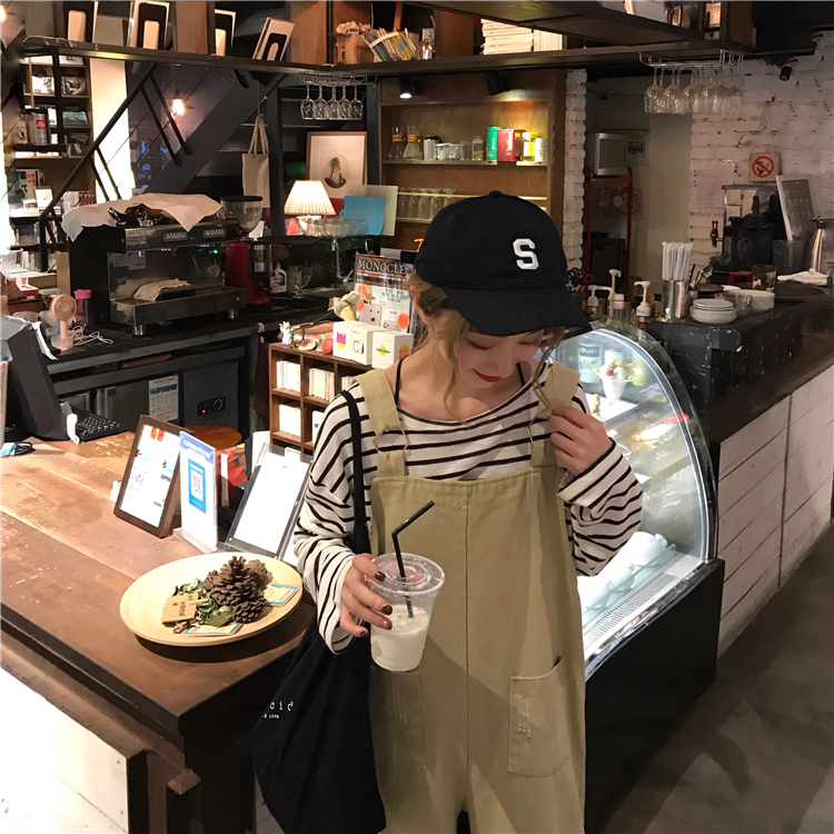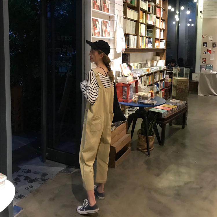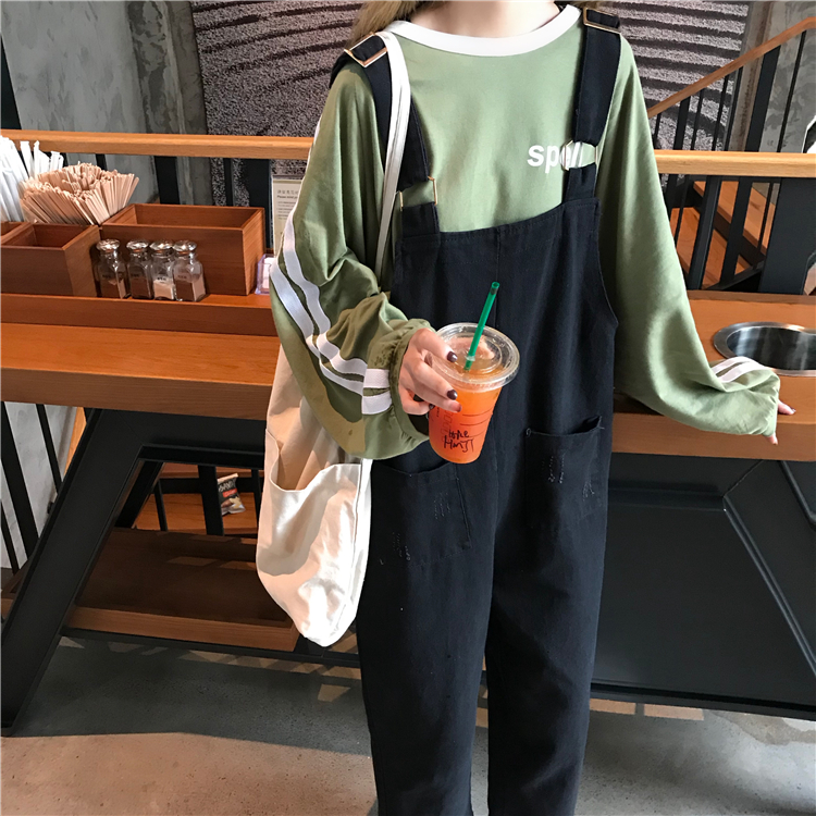 / 秋季女裝韓版磨破口袋背帶褲連體褲寬松直筒褲九分褲休閑褲闊腿褲