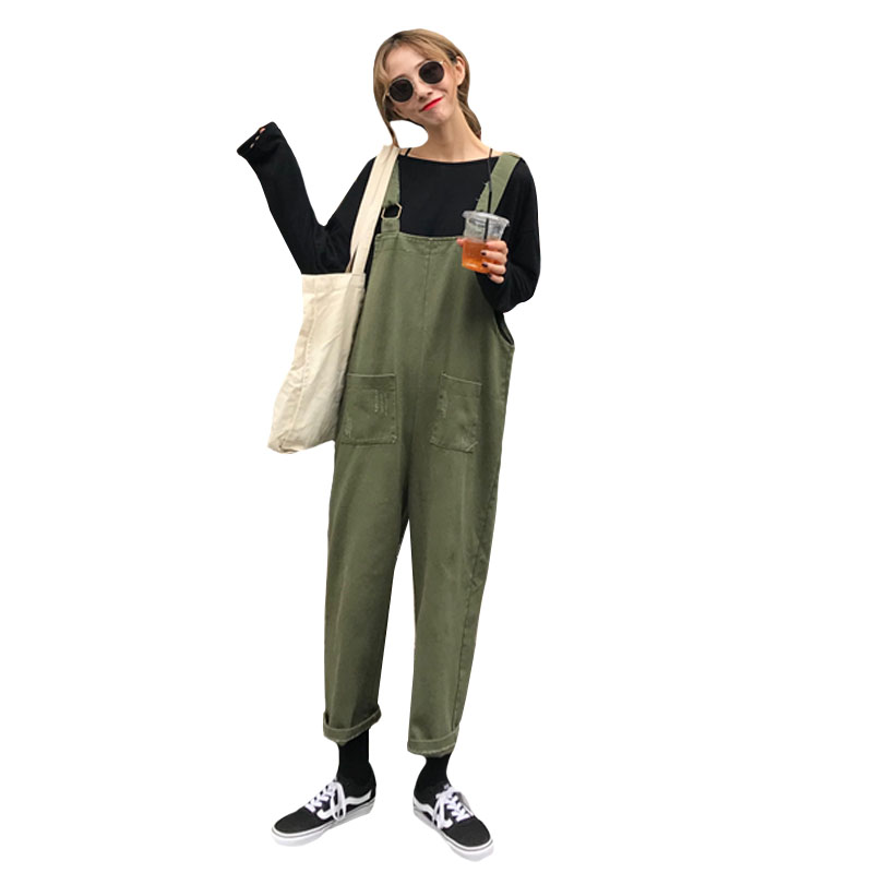 秋季女裝韓版磨破口袋背帶褲連體褲寬松直筒褲九分褲休閑褲闊腿褲