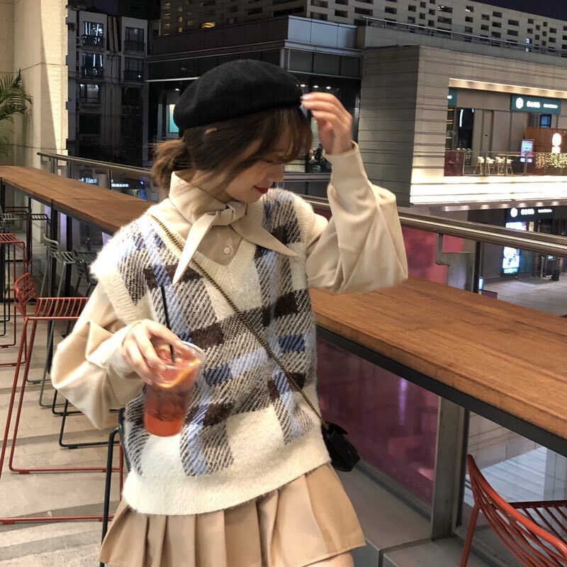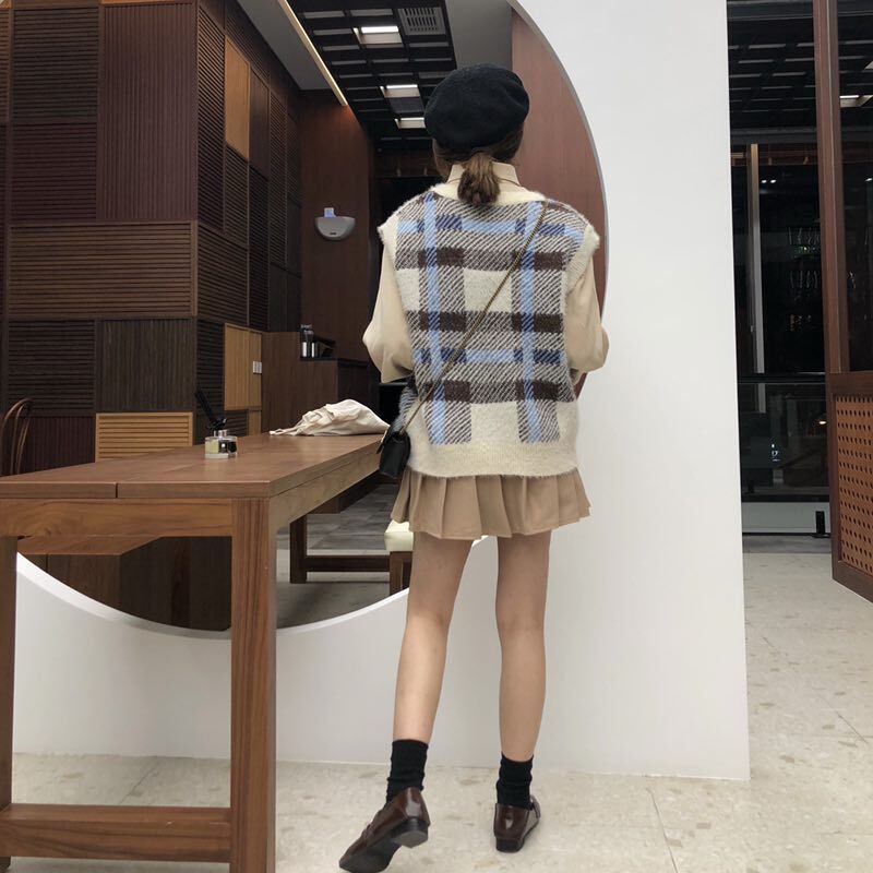 2018秋冬新款韓版拼色背心加厚襯衫百褶裙港風時尚套裝兩件套女潮