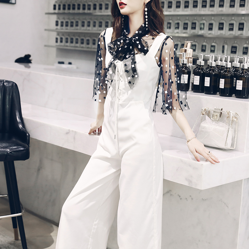 / 俏皮套裝女兩件夏韓版氣質網紗中袖上衣打底衫白色高腰背帶連體褲