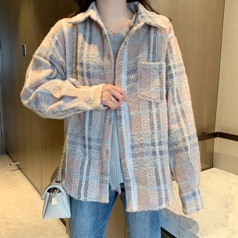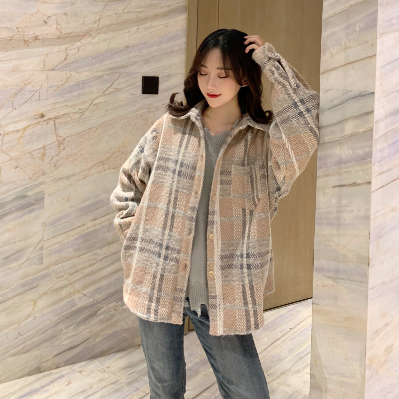 寬松粉色格子紋中長款長袖羊毛呢子大衣毛呢外套女秋冬2018新款潮
